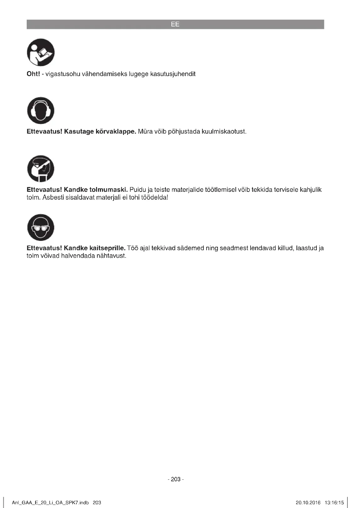 Oht! - vigastusohu vähendamiseks lugege kasutusjuhendit Ettevaatus! Kasutage kõrvaklappe. Müra võib põhjustada kuulmiskaotust. Ettevaatus! Kandke kaitseprille. Töö ajal tekkivad sädemed ning seadmest lendavad killud, laastud ja tolm võivad halvendada nähtavust. Ettevaatus! Kandke tolmumaski. Puidu ja teiste materjalide töötlemisel võib tekkida tervisele kahjulik tolm. Asbesti sisaldavat materjali ei tohi töödelda! Anl_GAA_E_20_Li_OA_SPK7.indb 203Anl_GAA_E_20_Li_OA_SPK7.indb 203 20.10.2016 13:16:1520.10.2016 13:16:15EE