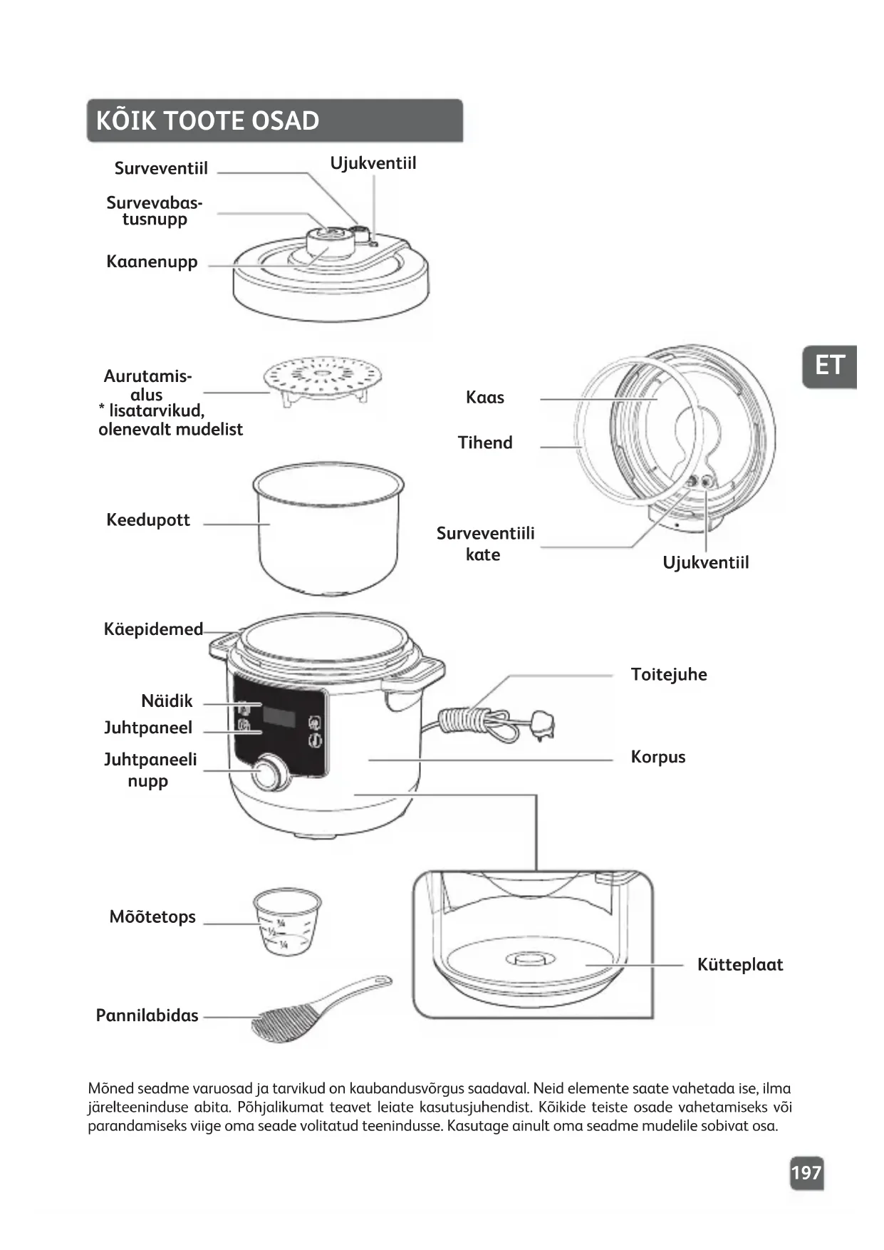 Juhtpaneel Keedupott Aurutamis- alus Käepidemed Näidik Juhtpaneeli nupp Mõõtetops Pannilabidas Kütteplaat Toitejuhe Korpus Kaanenupp Survevabas- tusnupp Surveventiil Ujukventiil Ujukventiil Tihend Surveventiili kate Kaas