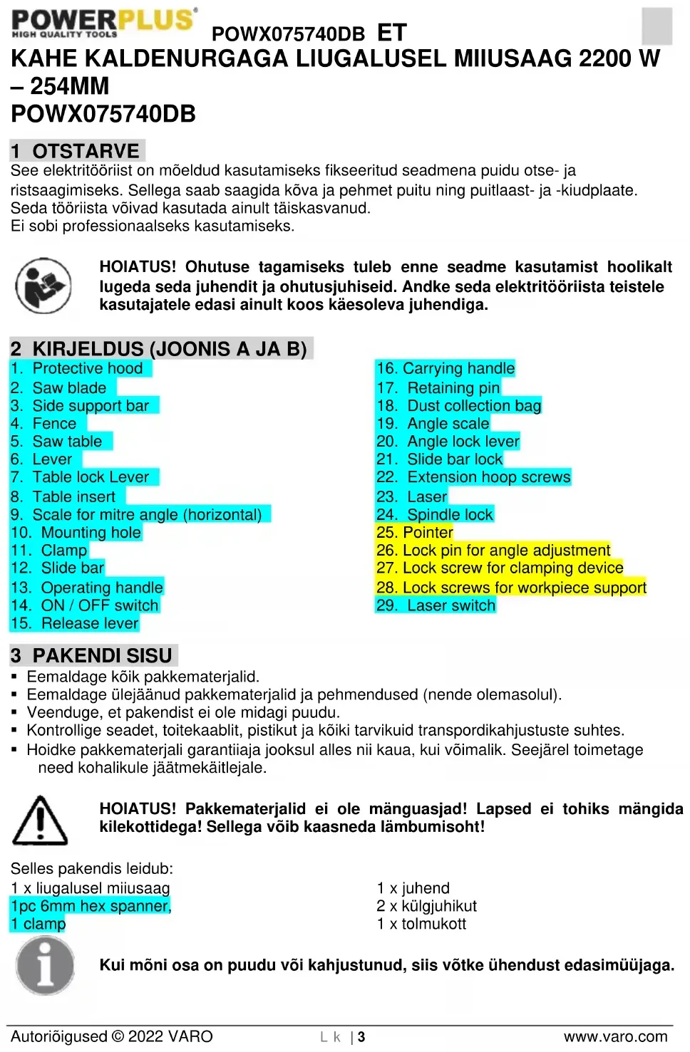 – 254MM POWX075740DB 1 OTSTARVE See elektritööriist on mõeldud kasutamiseks fikseeritud seadmena puidu otse- ja ristsaagimiseks. Sellega saab saagida kõva ja pehmet puitu ning puitlaast- ja -kiudplaate. Seda tööriista võivad kasutada ainult täiskasvanud. Ei sobi professionaalseks kasutamiseks. HOIATUS! Ohutuse tagamiseks tuleb enne seadme kasutamist hoolikalt lugeda seda juhendit ja ohutusjuhiseid. Andke seda elektritööriista teistele kasutajatele edasi ainult koos käesoleva juhendiga. 2 KIRJELDUS (JOONIS A JA B)