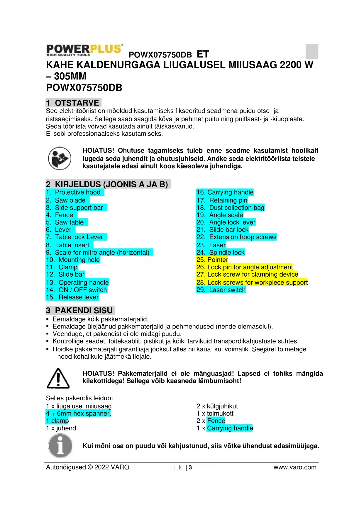 – 305MM POWX075750DB 1 OTSTARVE See elektritööriist on mõeldud kasutamiseks fikseeritud seadmena puidu otse- ja ristsaagimiseks. Sellega saab saagida kõva ja pehmet puitu ning puitlaast- ja -kiudplaate. Seda tööriista võivad kasutada ainult täiskasvanud. Ei sobi professionaalseks kasutamiseks. HOIATUS! Ohutuse tagamiseks tuleb enne seadme kasutamist hoolikalt lugeda seda juhendit ja ohutusjuhiseid. Andke seda elektritööriista teistele kasutajatele edasi ainult koos käesoleva juhendiga. 2 KIRJELDUS (JOONIS A JA B)