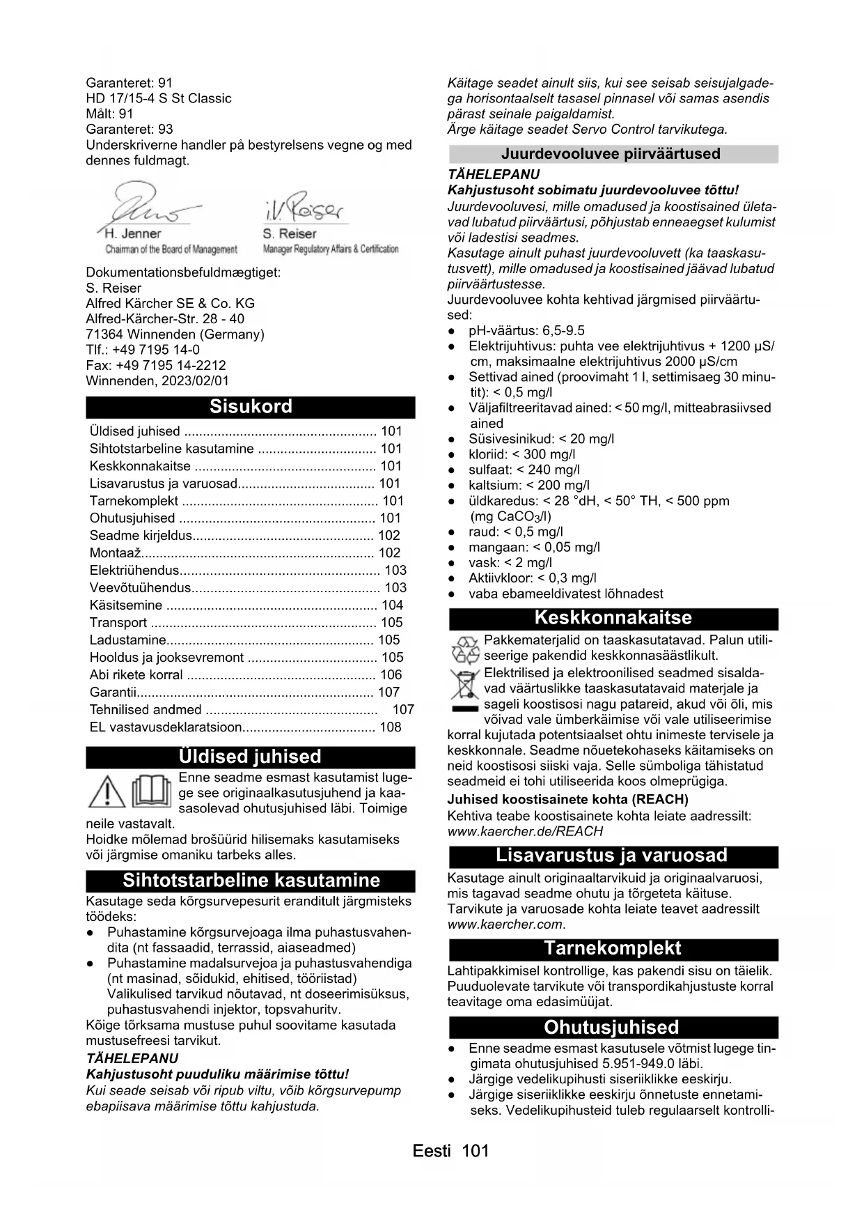 dB(A)8686919193 HD 9/20-4 S ST Classic HD 10/21-4 S ST Classic HD 10/25-4 S ST Classic HD 13/18-4 S ST Classic HD 17/15-4 S ST ClassicEesti 101 Garanteret: 91 HD 17/15-4 S St Classic Målt: 91 Garanteret: 93 Underskriverne handler på bestyrelsens vegne og med dennes fuldmagt. Dokumentationsbefuldmægtiget: S. Reiser Alfred Kärcher SE & Co. KG Alfred-Kärcher-Str. 28 - 40 71364 Winnenden (Germany) Tlf.: +49 7195 14-0 Fax: +49 7195 14-2212 Winnenden, 2023/02/01 Sisukord Üldised juhised Enne seadme esmast kasutamist luge- ge see originaalkasutusjuhend ja kaa- sasolevad ohutusjuhised läbi. Toimige neile vastavalt. Hoidke mõlemad brošüürid hilisemaks kasutamiseks või järgmise omaniku tarbeks alles. Sihtotstarbeline kasutamine Kasutage seda kõrgsurvepesurit eranditult järgmisteks töödeks: ● Puhastamine kõrgsurvejoaga ilma puhastusvahen- dita (nt fassaadid, terrassid, aiaseadmed) ● Puhastamine madalsurvejoa ja puhastusvahendiga (nt masinad, sõidukid, ehitised, tööriistad) Valikulised tarvikud nõutavad, nt doseerimisüksus, puhastusvahendi injektor, topsvahuritv. Kõige tõrksama mustuse puhul soovitame kasutada mustusefreesi tarvikut. TÄHELEPANU Kahjustusoht puuduliku määrimise tõttu! Kui seade seisab või ripub viltu, võib kõrgsurvepump ebapiisava määrimise tõttu kahjustuda. Käitage seadet ainult siis, kui see seisab seisujalgade- ga horisontaalselt tasasel pinnasel või samas asendis pärast seinale paigaldamist. Ärge käitage seadet Servo Control tarvikutega. Juurdevooluvee piirväärtused TÄHELEPANU Kahjustusoht sobimatu juurdevooluvee tõttu! Juurdevooluvesi, mille omadused ja koostisained ületa- vad lubatud piirväärtusi, põhjustab enneaegset kulumist või ladestisi seadmes. Kasutage ainult puhast juurdevooluvett (ka taaskasu- tusvett), mille omadused ja koostisained jäävad lubatud piirväärtustesse. Juurdevooluvee kohta kehtivad järgmised piirväärtu- sed: ● pH-väärtus: 6,5-9.5 ● Elektrijuhtivus: puhta vee elektrijuhtivus + 1200 µS/ cm, maksimaalne elektrijuhtivus 2000 µS/cm ● Settivad ained (proovimaht 1 l, settimisaeg 30 minu- tit): < 0,5 mg/l ● Väljafiltreeritavad ained: < 50 mg/l, mitteabrasiivsed ained ● Süsivesinikud: < 20 mg/l ● kloriid: < 300 mg/l ● sulfaat: < 240 mg/l ● kaltsium: < 200 mg/l ● üldkaredus: < 28 °dH, < 50° TH, < 500 ppm (mg CaCO