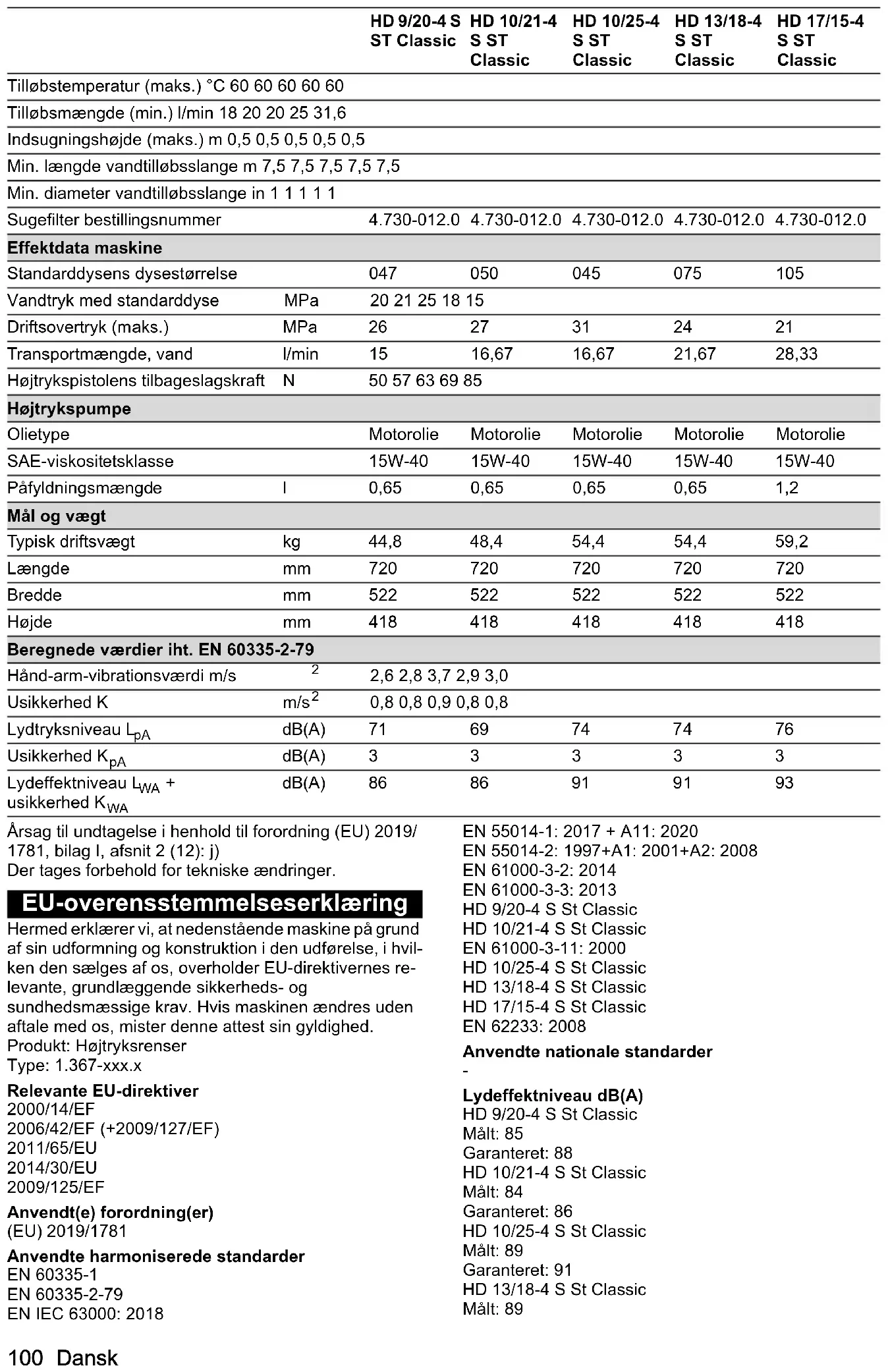 Veevõtuühendus Juurdevoolurõhk (maks.) MPa 1 1 1 1 1 Juurdevoolu temperatuur (maks.) °C 60 60 60 60 60 Juurdevoolu kogus (min.) l/min 18 20 20 25 31,6 Sissevõtu kõrgus (maks.) m 0,5 0,5 0,5 0,5 0,5 Vee pealevoolu vooliku minimaalne pikkus m 7,5 7,5 7,5 7,5 7,5 Vee pealevoolu vooliku minimaalne läbimõõt in11111 Imifiltri tellimisnumber 4.730-012.0 4.730-012.0 4.730-012.0 4.730-012.0 4.730-012.0 Seadme võimsusandmed Standarddüüsi suurus 047 050 045 075 105 Vee töösurve standardotsakuga MPa 20 21 25 18 15 Töö ülerõhk (maks.) MPa 26 27 31 24 21 Juurdevoolu kogus, vesi l/min 15 16,67 16,67 21,67 28,33 Kõrgsurvepüstoli tagasilöögijõud N 50 57 63 69 85 Kõrgsurvepump Õlisort Mootoriõli Mootoriõli Mootoriõli Mootoriõli Mootoriõli SAE viskoossusklass 15W-40 15W-40 15W-40 15W-40 15W-40 Täitekogus l 0,65 0,65 0,65 0,65 1,2 Mõõtmed ja kaalud Tüüpiline töökaal kg 44,8 48,4 54,4 54,4 59,2 Pikkus mm 720 720 720 720 720 Laius mm 522 522 522 522 522 Kõrgus mm 418 418 418 418 418108 Latviešu Erandi põhjus vastavalt määrusele (EL) 2019/1781 lisa I peatükile 2 (12): j) Õigus tehnilisteks muudatusteks. EL vastavusdeklaratsioon Käesolevaga deklareerime, et alljärgnevalt nimetatud masin vastab oma kontseptsiooni ja koosteliigi põhjal ning meie poolt turule viidud teostuses EL direktiivide asjaomastele põhilistele ohutus- ja tervisenõuetele. Ma- sinal meiega kooskõlastamata muudatuste teostamisel kaotab käesolev deklaratsioon kehtivuse. Toode: Kõrgsurvepesur Tüüp: 1.367-xxx.x Asjaomased EL direktiivid 2000/14/EÜ 2006/42/EÜ (+2009/127/EÜ) 2011/65/EL 2014/30/EL 2009/125/EÜ Kohaldatud määrus(ed) (EL) 2019/1781 Kohaldatud ühtlustatud normid EN 60335-1 EN 60335-2-79 EN IEC 63000: 2018 EN 55014-1: 2017 + A11: 2020 EN 55014-2: 1997+A1: 2001+A2: 2008 EN 61000-3-2: 2014 EN 61000-3-3: 2013 HD 9/20-4 S St Classic HD 10/21-4 S St Classic EN 61000-3-11: 2000 HD 10/25-4 S St Classic HD 13/18-4 S St Classic HD 17/15-4 S St Classic EN 62233: 2008 Kohaldatud riiklikud normid