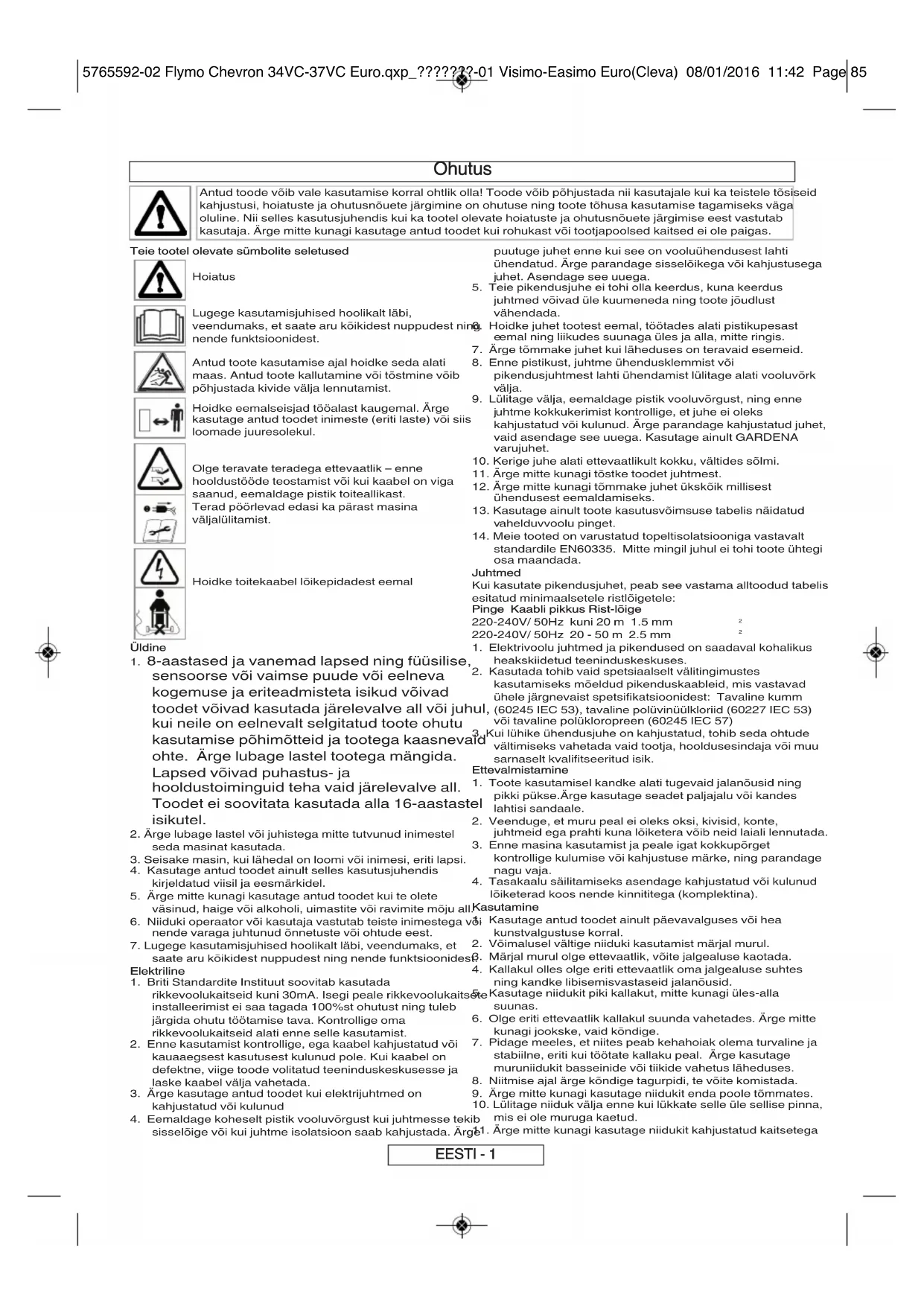 Предупреждение! Компания Husqvarna UK Ltd. не принимает обязательств по этой гарантии по неисправностям, вызванным в целом или частично, прямо или косвенно, установкой деталей для замены или дополнительных деталей, не изготовленных или не утвержденных компанией Husqvarna UK Ltd., или по машине, которая была изменена каким-либо способом. РУССКИЙ - 4 5765592-02 Flymo Chevron 34VC-37VC Euro.qxp_???????-01 Visimo-Easimo Euro(Cleva) 08/01/2016 11:42 Page 84Ohutus Antud toode võib vale kasutamise korral ohtlik olla! Toode võib põhjustada nii kasutajale kui ka teistele tõsiseid kahjustusi, hoiatuste ja ohutusnõuete järgimine on ohutuse ning toote tõhusa kasutamise tagamiseks väga oluline. Nii selles kasutusjuhendis kui ka tootel olevate hoiatuste ja ohutusnõuete järgimise eest vastutab kasutaja. Ärge mitte kunagi kasutage antud toodet kui rohukast või tootjapoolsed kaitsed ei ole paigas. Teie tootel olevate sümbolite seletused Hoiatus Lugege kasutamisjuhised hoolikalt läbi, veendumaks, et saate aru kõikidest nuppudest ning nende funktsioonidest. Antud toote kasutamise ajal hoidke seda alati maas. Antud toote kallutamine või tõstmine võib põhjustada kivide välja lennutamist. Hoidke eemalseisjad tööalast kaugemal. Ärge kasutage antud toodet inimeste (eriti laste) või siis loomade juuresolekul. Olge teravate teradega ettevaatlik – enne hooldustööde teostamist või kui kaabel on viga saanud, eemaldage pistik toiteallikast. Terad pöörlevad edasi ka pärast masina väljalülitamist. Hoidke toitekaabel lõikepidadest eemal Üldine