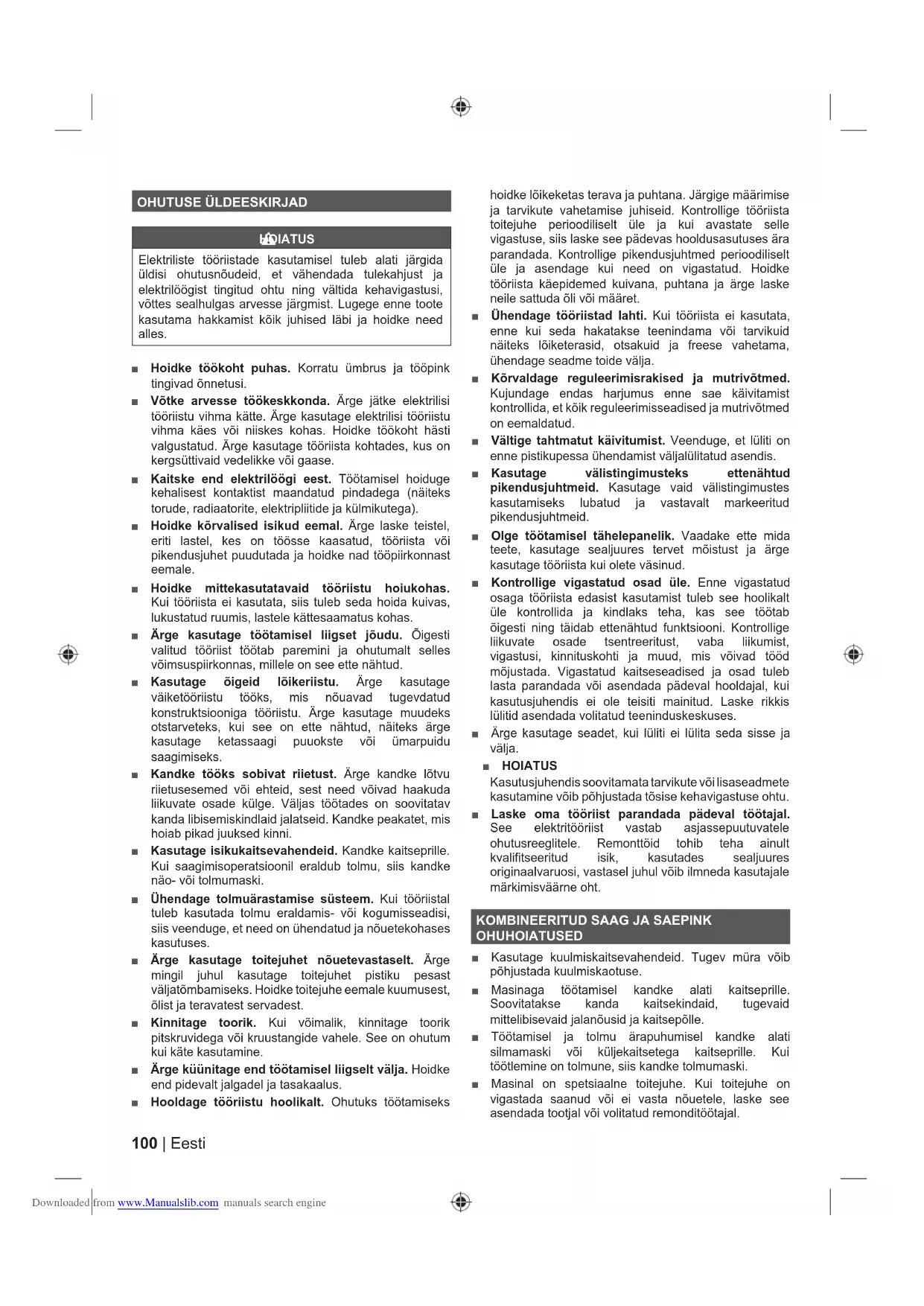Ŷ Enne masina käivitamist lugege kasutusjuhend läbi. Ŷ Saepink peab olema heas töökorras ja spindel ilma deformatsioonideta ning ei tohi vibreerida. Ŷ Ärge kasutage saagi ilma, et kaitsed on oma NRKWDGHOHULWLWlKHOHSDQHOLNWXOHEROODSlUDVWW||UHåLLPL vahetamist. Hoidke kaitsed töökorras ja nõuetekohaselt hooldatud olekus. Ŷ Veenduge, et töötaja on masinaga töötamiseks nõuetekohaselt välja õppinud. Ŷ Kasutage hooldamise ajal alati kaitseprille, mis kaitsevad silmi ka külgedelt. Soovitatakse kanda kaitsekindaid, tugevaid mittelibisevaid jalanõusid ja kaitsepõlle. Ŷ Enne ükskõik millise tarviku kasutamist tutvuge kasutusjuhendi vastavate nõuetega. Tarvikute ebaõige kasutamine võib põhjustada vigastuse. Ŷ Kasutage ainult kasutusjuhendis ettenähtud saekettaid, mis vastavad standardile EN 847-1. Ŷ Pidage kinni saekettale märgitud maksimaalkiirusest. Veenduge, et saekettal märgitud pöörlemiskiirus on sael märgitud pöörlemiskiirusega vähemalt võrdne. Ŷ Kasutage ainult õiget mõõtu ja õige (saeketta mitte teemantketta) võlliavaga saeketast. Sae kinnitusdetailidega mittesobivad saekettad pöörlevad ekstsentriliselt ja põhjustavad sellega kontrolli kadumist sae üle. Ŷ Ärge kasutage saeketast, mille kettaosa on paksem või mille hamba paksus on väiksem kui lõhestusnoa SDNVXVSODDWVDHOHY}LSODDWVDHUHåLLPLMDRNV Ŷ Ärge kasutage saekettaid, mille läbimõõt on suurem või väiskem kui soovitatud. Ärge kasutage saeketta sobitamiseks mingeid vaheseibe. Ŷ Enne saeketta kasutamise alustamist kontrollige selle hambad üle vigastuste ja ebahariliku väljanägemise suhtes. Vigastatud ja lõdvad saehambad võivad välja paiskuda ning seetõttu põhjustada kehavigastuse. Ŷ Ärge kasutage pragunenud ega auklikku saeketast. Ärge kasutage saekettaid, mis on vigastatud või deformeerunud. Ŷ Ärge kunagi kasutage saeketast kui see on vigastatud või deformeerunud. Remontimine ei ole lubatud. Ŷ Ärge kasutage kiirlõiketerasest saekettaid. Ŷ Enne kasutamist veenduge, et saeketas on nõuetekohaselt paigaldatud. Enne töö alustamist keerake võlli mutter kindlalt kinni. (Pöördemoment: 12- 15 Nm) Ŷ Kinnituskruvisid ja mutreid tohib pingutada vaid selleks ette nähtud mutrivõtmega. Ŷ Pingutamisel ei ole lubatud mutrivõtme õla pikendamine Downloaded from www.Manualslib.com manuals search engineEN