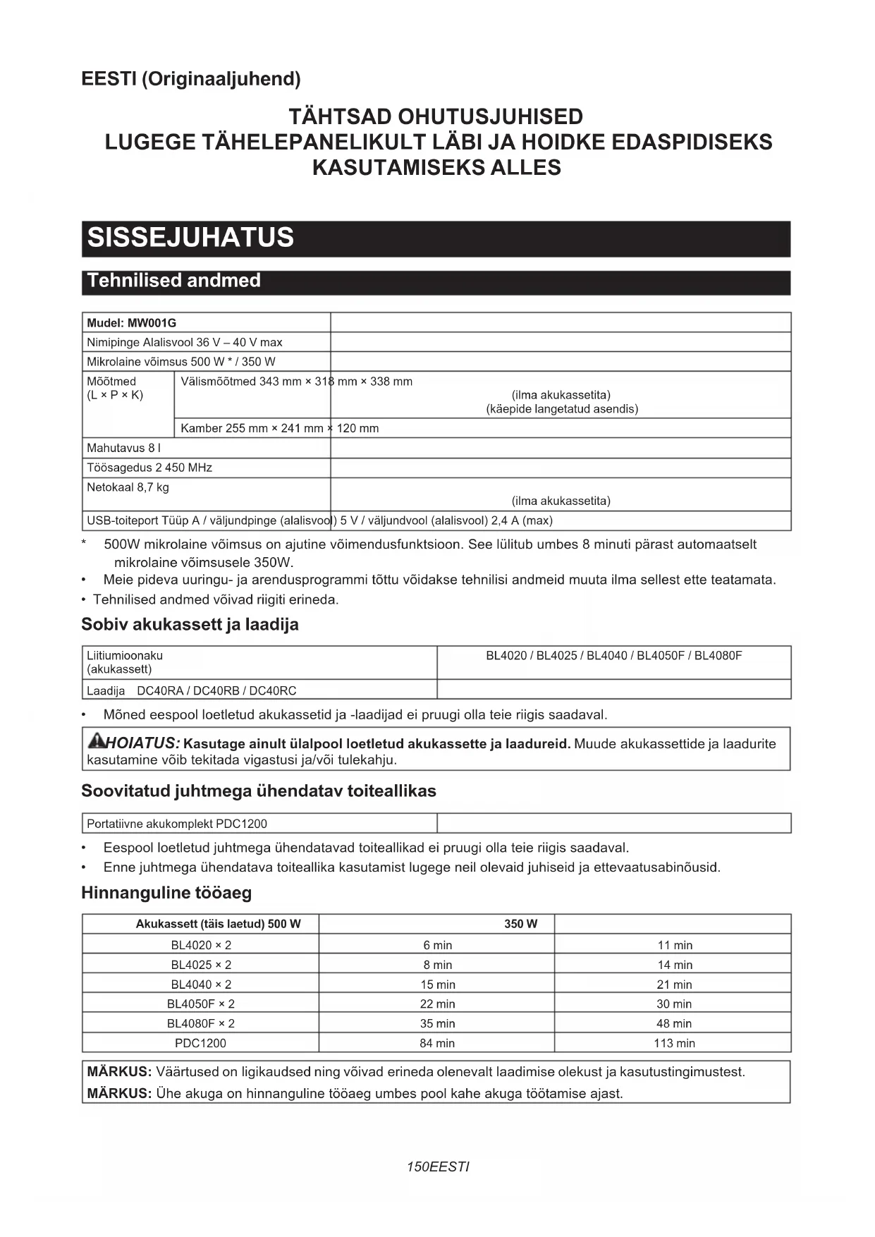 LUGEGE TÄHELEPANELIKULT LÄBI JA HOIDKE EDASPIDISEKS KASUTAMISEKS ALLES SISSEJUHATUS Tehnilised andmed Mudel: MW001GNimipinge Alalisvool 36 V – 40 V maxMikrolaine võimsus 500 W * / 350 WMõõtmed(L × P × K)Välismõõtmed 343 mm × 318 mm × 338 mm(ilma akukassetita)(käepide langetatud asendis)Kamber 255 mm × 241 mm × 120 mmMahutavus 8 lTöösagedus 2 450 MHzNetokaal 8,7 kg(ilma akukassetita)USB-toiteport TüüpA/väljundpinge(alalisvool)5V/väljundvool(alalisvool)2,4A(max)* 500Wmikrolainevõimsusonajutinevõimendusfunktsioon.Seelülitubumbes8minutipärastautomaatseltmikrolaine võimsusele 350W.• Meiepidevauuringu-jaarendusprogrammitõttuvõidaksetehnilisiandmeidmuutailmasellestetteteatamata.• Tehnilised andmed võivad riigiti erineda. Sobiv akukassett ja laadija Liitiumioonaku(akukassett)BL4020 / BL4025 / BL4040 / BL4050F / BL4080FLaadija DC40RA / DC40RB / DC40RC• Mõnedeespoolloetletudakukassetidja-laadijadeipruugiollateieriigissaadaval. HOIATUS: Kasutage ainult ülalpool loetletud akukassette ja laadureid.Muudeakukassettidejalaadurite kasutaminevõibtekitadavigastusija/võitulekahju. Soovitatud juhtmega ühendatav toiteallikas Portatiivne akukomplekt PDC1200• Eespoolloetletudjuhtmegaühendatavadtoiteallikadeipruugiollateieriigissaadaval.• Ennejuhtmegaühendatavatoiteallikakasutamistlugegeneilolevaidjuhiseidjaettevaatusabinõusid. Hinnanguline tööaeg Akukassett (täis laetud) 500 W 350 WBL4020 × 2 6 min 11 minBL4025 × 2 8 min 14 minBL4040 × 2 15 min 21 minBL4050F × 2 22 min 30 minBL4080F × 2 35 min 48 minPDC1200 84 min 113 min MÄRKUS:Väärtusedonligikaudsedningvõivaderinedaolenevaltlaadimiseolekustjakasutustingimustest. MÄRKUS:Üheakugaonhinnangulinetööaegumbespoolkaheakugatöötamiseajast.151 EESTI Kavandatud kasutus Seadeonettenähtudtoidusoojendamiseks. Olulised kaitsemeetmed HOIATUS! Sellel seadmel tohivad töid teha ainult kvalitseeritud hooldustehnikud. Kontrollimiseks, remontimiseks ja reguleerimiseks pöörduge lähi- masse volitatud teenindusse. HOIATUS! Ärge püüdke seadet kasutada lahtise uksega, sest muidu võib tekkida kokkupuude kahju- liku mikrolaineenergiaga. HOIATUS! Kui esineb kahjustusi uksel (paindu- mine), hingedel (katki või lahti tulnud), uksetihen- ditel või tihendipindadel, ei tohi mikrolaineahju kasutada enne, kui väljaõppinud isik on selle parandanud. HOIATUS! Hooldus- ja remonditöid, mille käigus on vaja eemaldada mikrolaineenergia eest kaitsvaid katteid tohib teha ainult väljaõppinud isik, teistele on see ohtlik. HOIATUS! Kasutage seadet ainult selles juhendis kirjeldatud ettenähtud otstarbel. HOIATUS! Ärge kasutage selles seadmes korrosiiv- seid kemikaale ega aure. HOIATUS! Seda tüüpi seade on mõeldud üksnes toidu kuumutamiseks, valmistamiseks ja kuivatami- seks. See ei ole mõeldud tööstuslikuks kasutami- seks ega laboris kasutamiseks. HOIATUS! Vedelikke ega muid toite ei tohi kuumu- tada suletud anumates, sest need võivad lõhkeda.
