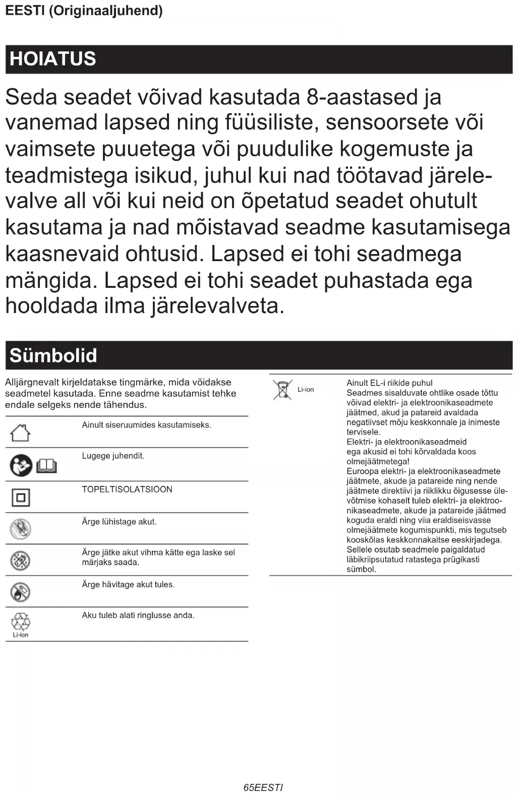 ► Pav.565 EESTI EESTI (Originaaljuhend) HOIATUS Seda seadet võivad kasutada 8-aastased ja vanemad lapsed ning füüsiliste, sensoorsete või vaimsete puuetega või puudulike kogemuste ja teadmistega isikud, juhul kui nad töötavad järele- valve all või kui neid on õpetatud seadet ohutult kasutama ja nad mõistavad seadme kasutamisega kaasnevaid ohtusid. Lapsed ei tohi seadmega mängida. Lapsed ei tohi seadet puhastada ega hooldada ilma järelevalveta. Sümbolid Alljärgnevalt kirjeldatakse tingmärke, mida võidakse seadmetel kasutada. Enne seadme kasutamist tehke endale selgeks nende tähendus. Ainult siseruumides kasutamiseks. Lugege juhendit. TOPELTISOLATSIOON Ärge lühistage akut. Ärge jätke akut vihma kätte ega laske sel märjaks saada. Ärge hävitage akut tules. Aku tuleb alati ringlusse anda. Li-ion Ainult EL-i riikide puhul Seadmes sisalduvate ohtlike osade tõttu võivad elektri- ja elektroonikaseadmete jäätmed, akud ja patareid avaldada negatiivset mõju keskkonnale ja inimeste tervisele. Elektri- ja elektroonikaseadmeid ega akusid ei tohi kõrvaldada koos olmejäätmetega! Euroopa elektri- ja elektroonikaseadmete jäätmete, akude ja patareide ning nende jäätmete direktiivi ja riiklikku õigusesse üle- võtmise kohaselt tuleb elektri- ja elektroo- nikaseadmete, akude ja patareide jäätmed koguda eraldi ning viia eraldiseisvasse olmejäätmete kogumispunkti, mis tegutseb kooskõlas keskkonnakaitse eeskirjadega. Sellele osutab seadmele paigaldatud läbikriipsutatud ratastega prügikasti sümbol.66 EESTI Laadimiseks valmis. Viivitusega laadimine (aku jahutamine, liiga külm aku või laadimise ootel). Laadimine (0–80%). Laadimine (80–100%). Laadimine on lõpetatud. Laadimine (jahutuse kõrvalekalle). Defektne aku. ETTEVAATUST!