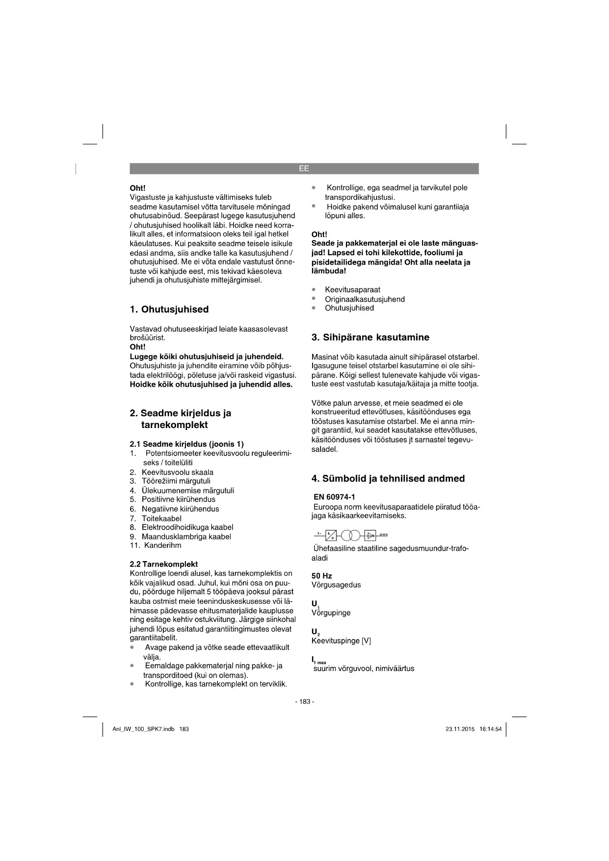 Ainult Euroopa Liidu riikidele Ärge visake elektrilisi tööriistu olmeprügi hulka! Euroopa Liidu direktiiviga 2012/19/EÜ elektri- ja elektroonikaseadmete jäätmete kohta ja siseriiklikele kohaldamistele tuleb kasutatud elektrilised tööriistad koguda kokku eraldi ja leida neile keskkonnasääst- lik taaskasutus. Taaskasutusalternatiiv tagasisaatmisnõudele: Elektriseadme omanik on kohustatud omandisuhte lõppemisel alternatiivina tagasisaatmisele kaasa aitama sobivale taaskasutusele. Seega võib vana seadme loovutada ka tagasivõtukohta, mis korraldab selle kõrvaldamise riikliku ringlusmajanduse ja jäätmeseadusandluse tähenduses. Asjasse ei puutu va- nade seadmete elektrikomponentideta lisaseadmed ja abivahendid. Tootedokumentatsiooni ja kaasasolevate dokumentide kordustrükk või muul viisil paljundamine, ka osa- liselt, on lubatud ainult iSC GmbH loal. Tehniliste muudatuste õigus reserveeritud Anl_IW_100_SPK7.indb 187Anl_IW_100_SPK7.indb 187 23.11.2015 16:14:5523.11.2015 16:14:55EE