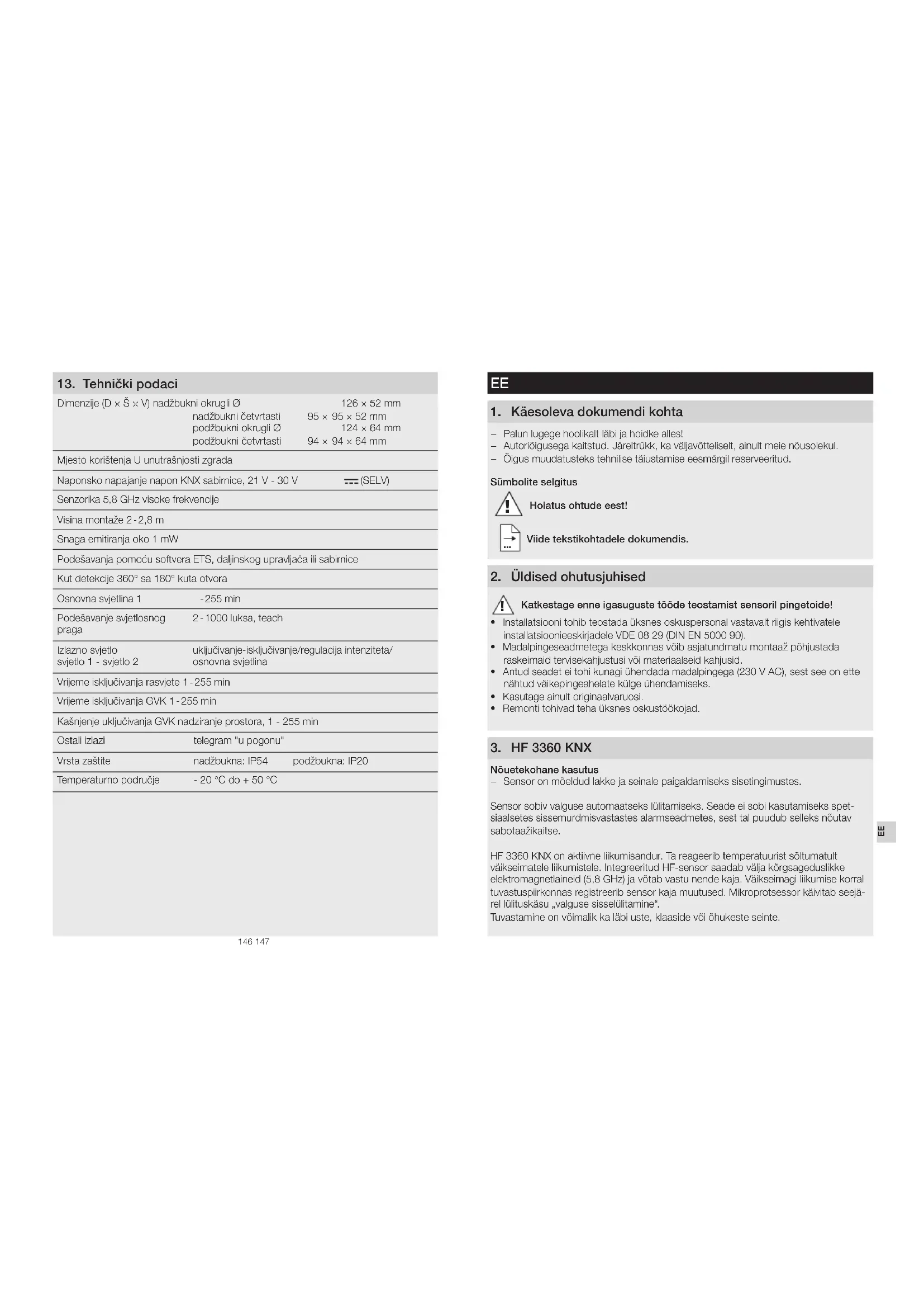 - Remonti tohivad teha üksnes oskustöökojad. 3 HF 3360 KNX Nõuetekohane kasutus – Sensor on mõeldud lakke ja seinale paigaldamiseks sisetingimustes. Sensor sobiv valguse automaatseks lülitamiseks. Seade ei sobi kasutamiseks spet- siaalsetes sissemurdmisvastastes alarmseadmetes, sest tal puudub selleks nõutav sabotaažikaitse. HF3360KNX on aktiivne liikumisandur. Ta reageerib temperatuurist sõltumatult väikseimatele liikumistele. Integreeritud HF-sensor saadab välja kõrgsageduslikke elektromagnetlaineid (5,8GHz) ja võtab vastu nende kaja. Väikseimagi liikumise korral tuvastuspiirkonnas registreerib sensor kaja muutused. Mikroprotsessor käivitab seejä- rel lülituskäsu „valguse sisselülitamine“. Tuvastamine on võimalik ka läbi uste, klaaside või õhukeste seinte.