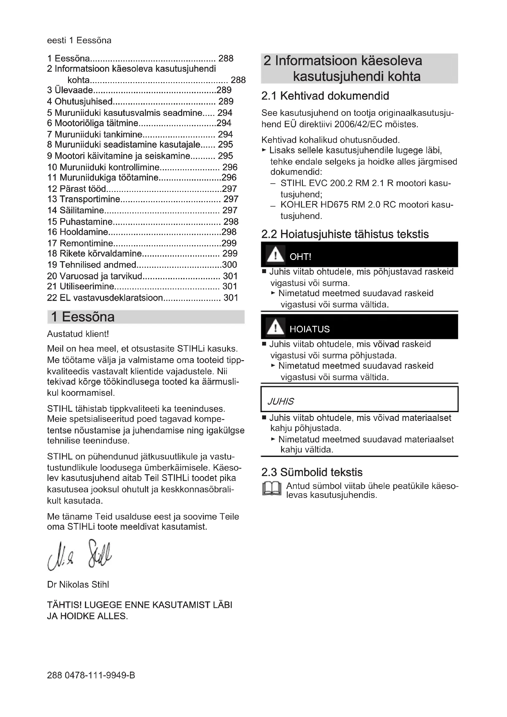 - 22 EL vastavusdeklaratsioon 1 Eessõna Austatud klient! Meil on hea meel, et otsustasite STIHLi kasuks. Me töötame välja ja valmistame oma tooteid tipp‐ kvaliteedis vastavalt klientide vajadustele. Nii tekivad kõrge töökindlusega tooted ka äärmusli‐ kul koormamisel. STIHL tähistab tippkvaliteeti ka teeninduses. Meie spetsialiseeritud poed tagavad kompe‐ tentse nõustamise ja juhendamise ning igakülgse tehnilise teeninduse. STIHL on pühendunud jätkusuutlikule ja vastu‐ tustundlikule loodusega ümberkäimisele. Käeso‐ lev kasutusjuhend aitab Teil STIHLi toodet pika kasutusea jooksul ohutult ja keskkonnasõbrali‐ kult kasutada. Me täname Teid usalduse eest ja soovime Teile oma STIHLi toote meeldivat kasutamist. Dr Nikolas Stihl TÄHTIS! LUGEGE ENNE KASUTAMIST LÄBI JA HOIDKE ALLES. 2 Informatsioon käesoleva kasutusjuhendi kohta p. 301