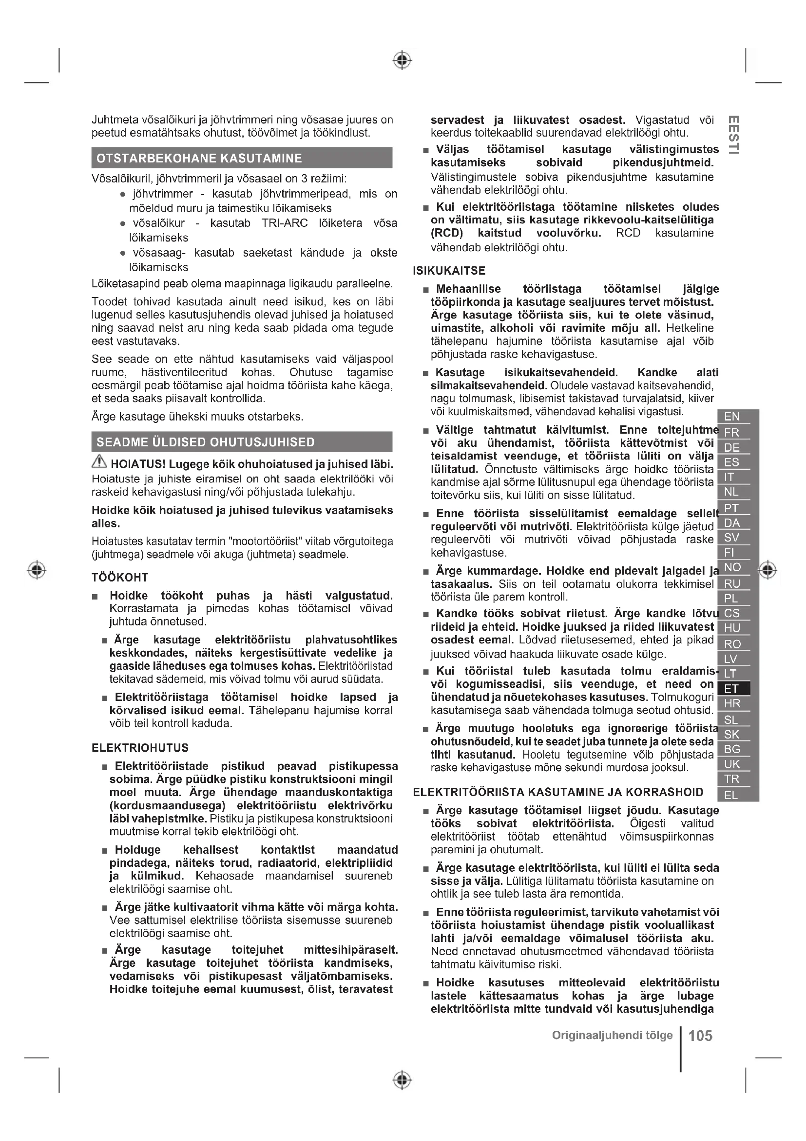 HOIATUS! Lugege kõik ohuhoiatused ja juhised läbi. Hoiatuste ja juhiste eiramisel on oht saada elektrilööki või raskeid kehavigastusi ning/või põhjustada tulekahju. Hoidke kõik hoiatused ja juhised tulevikus vaatamiseks alles. Hoiatustes kasutatav termin "mootortööriist" viitab võrgutoitega (juhtmega) seadmele või akuga (juhtmeta) seadmele. TÖÖKOHT ■ Hoidke töökoht puhas ja hästi valgustatud. Korrastamata ja pimedas kohas töötamisel võivad juhtuda õnnetused. ■ Ärge kasutage elektritööriistu plahvatusohtlikes keskkondades, näiteks kergestisüttivate vedelike ja gaaside läheduses ega tolmuses kohas. Elektritööriistad tekitavad sädemeid, mis võivad tolmu või aurud süüdata. ■ Elektritööriistaga töötamisel hoidke lapsed ja kõrvalised isikud eemal. Tähelepanu hajumise korral võib teil kontroll kaduda. ELEKTRIOHUTUS ■ Elektritööriistade pistikud peavad pistikupessa sobima. Ärge püüdke pistiku konstruktsiooni mingil moel muuta. Ärge ühendage maanduskontaktiga (kordusmaandusega) elektritööriistu elektrivõrku läbi vahepistmike. Pistiku ja pistikupesa konstruktsiooni muutmise korral tekib elektrilöögi oht. ■ Hoiduge kehalisest kontaktist maandatud pindadega, näiteks torud, radiaatorid, elektripliidid ja külmikud. Kehaosade maandamisel suureneb elektrilöögi saamise oht. ■ Ärge jätke kultivaatorit vihma kätte või märga kohta. Vee sattumisel elektrilise tööriista sisemusse suureneb elektrilöögi saamise oht. ■ Ärge kasutage toitejuhet mittesihipäraselt. Ärge kasutage toitejuhet tööriista kandmiseks, vedamiseks või pistikupesast väljatõmbamiseks. Hoidke toitejuhe eemal kuumusest, õlist, teravatest servadest ja liikuvatest osadest. Vigastatud või keerdus toitekaablid suurendavad elektrilöögi ohtu. ■ Väljas töötamisel kasutage välistingimustes kasutamiseks sobivaid pikendusjuhtmeid. Välistingimustele sobiva pikendusjuhtme kasutamine vähendab elektrilöögi ohtu. ■ Kui elektritööriistaga töötamine niisketes oludes on vältimatu, siis kasutage rikkevoolu-kaitselülitiga (RCD) kaitstud vooluvõrku. RCD kasutamine vähendab elektrilöögi ohtu. ISIKUKAITSE ■ Mehaanilise tööriistaga töötamisel jälgige tööpiirkonda ja kasutage sealjuures tervet mõistust. Ärge kasutage tööriista siis, kui te olete väsinud, uimastite, alkoholi või ravimite mõju all. Hetkeline tähelepanu hajumine tööriista kasutamise ajal võib põhjustada raske kehavigastuse. ■ Kasutage isikukaitsevahendeid. Kandke alati silmakaitsevahendeid. Oludele vastavad kaitsevahendid, nagu tolmumask, libisemist takistavad turvajalatsid, kiiver või kuulmiskaitsmed, vähendavad kehalisi vigastusi. ■ Vältige tahtmatut käivitumist. Enne toitejuhtme või aku ühendamist, tööriista kättevõtmist või teisaldamist veenduge, et tööriista lüliti on välja lülitatud. Õnnetuste vältimiseks ärge hoidke tööriista kandmise ajal sõrme lülitusnupul ega ühendage tööriista toitevõrku siis, kui lüliti on sisse lülitatud. ■ Enne tööriista sisselülitamist eemaldage sellelt reguleervõti või mutrivõti. Elektritööriista külge jäetud reguleervõti või mutrivõti võivad põhjustada raske kehavigastuse. ■ Ärge kummardage. Hoidke end pidevalt jalgadel ja tasakaalus. Siis on teil ootamatu olukorra tekkimisel tööriista üle parem kontroll. ■ Kandke tööks sobivat riietust. Ärge kandke lõtvu riideid ja ehteid. Hoidke juuksed ja riided liikuvatest osadest eemal. Lõdvad riietusesemed, ehted ja pikad juuksed võivad haakuda liikuvate osade külge. ■ Kui tööriistal tuleb kasutada tolmu eraldamis- või kogumisseadisi, siis veenduge, et need on ühendatud ja nõuetekohases kasutuses. Tolmukoguri kasutamisega saab vähendada tolmuga seotud ohtusid. ■ Ärge muutuge hooletuks ega ignoreerige tööriista ohutusnõudeid, kui te seadet juba tunnete ja olete seda tihti kasutanud. Hooletu tegutsemine võib põhjustada raske kehavigastuse mõne sekundi murdosa jooksul.