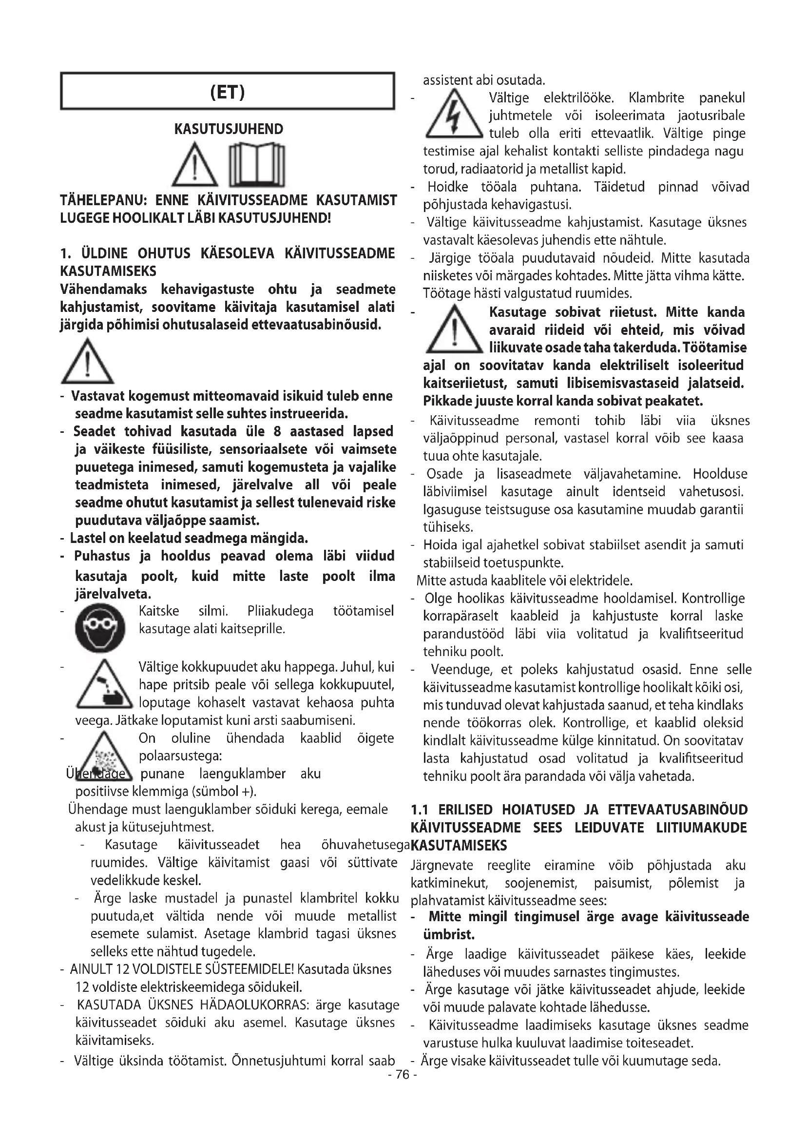 KASUTAMISEKS Vähendamaks kehavigastuste ohtu ja seadmete kahjustamist, soovitame käivitaja kasutamisel alati järgida põhimisi ohutusalaseid ettevaatusabinõusid. - Vastavat kogemust mitteomavaid isikuid tuleb enne seadme kasutamist selle suhtes instrueerida. - Seadet tohivad kasutada üle 8 aastased lapsed ja väikeste füüsiliste, sensoriaalsete või vaimsete puuetega inimesed, samuti kogemusteta ja vajalike teadmisteta inimesed, järelvalve all või peale seadme ohutut kasutamist ja sellest tulenevaid riske puudutava väljaõppe saamist. - Lastel on keelatud seadmega mängida. - Puhastus ja hooldus peavad olema läbi viidud kasutaja poolt, kuid mitte laste poolt ilma järelvalveta.