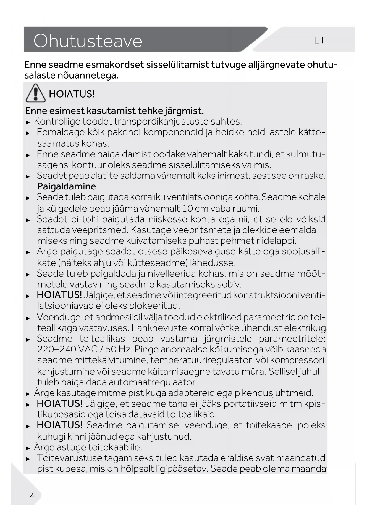 HOIATUS! Jäävee funktsiooniga külmikute puhul pöörake tähelepanu järgmisele hoiatusele: Seadmete puhul, mis ei ole ette nähtud ühendamiseks veevarustusega. HOIATUS! Täitke ainult joogiveega. Veevarustussüsteemiga ühendatavad seadmed. HOIATUS! Ühendage ainult joogiveevarustussüsteemiga. Kui soovite veesüsteemi puhastada, vaadake kasutusjuhendit. Küsimuste korral võtke ühendust müügijärgse teenindusega.ET Ohutusteave