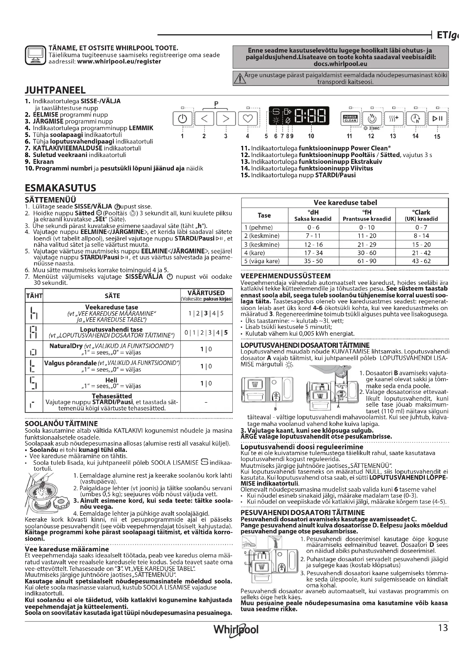 1:15 11,0 1,10 LEMMIKPROGRAMM : võimalus salvestada lemmikprogramm, et seda oleks mugavam kasutada. Valige nupuga EELMINE/JÄRGMINE programm ja hoidke seejärel programminuppu LEMMIK 3 sekundit all. KATLAKIVIEEMALDUSE alarm : tuvastatud on katlakivi kogunemine seadme sisekomponentidel. Kontrollige, kas veekareduse säte on õige ja kas paagis on soola (vt ESMAKASUTUS), seejärel kasutage katlakivieemalduse toodet (soovitatav on tootemark WPro) programmiga Isepuhastus. Kui katlakivi on eemaldatud, lõpetatakse ikooni kuvamine. Kui eespool toodud toiminguid ei tehta, langeb seadme jõudlus. Katlakivieemalduse hoiatus hakkab vilkuma ja ekaanil kuvatakse alarm «dES». Kui ka nüüd midagi ei tehta, saab seadmes käivitada piiratud arvu tsükleid (näidatud koos alarmiga «dES» ), misjärel kasutus blokee- ritakse, et ennetada komponentide kahjustusi, seejärel saab kasutada ainult programmi Isepuhastus. Täieliku katlakivieemalduse järel seade deblokeeritakse. Väga suure koguse katlakivi korral võib olla vajalik selle eemaldamiseks katlakivieemaldus teha kaks korda. POOLTÄIS : kui pestavaid nõusid pole palju, kasutage olenevalt valitud programmist kas vee, elektri või aja säästmiseks funktsiooni POOLTÄIS. Ärge unustage vähendada pesuvahendi kogust. EKSTRAKUIV : viimase loputuse järel kasutatav kõrgem temperatuur ja pikem kuivatusfaas aitavad nõusid paremini kuivatada. EKSTRAKUIV valik pikendab pesutsüklit. VIIVITUS : programmi käivitamist saab 30 minutit kuni 24 tundi edasi lükata.
