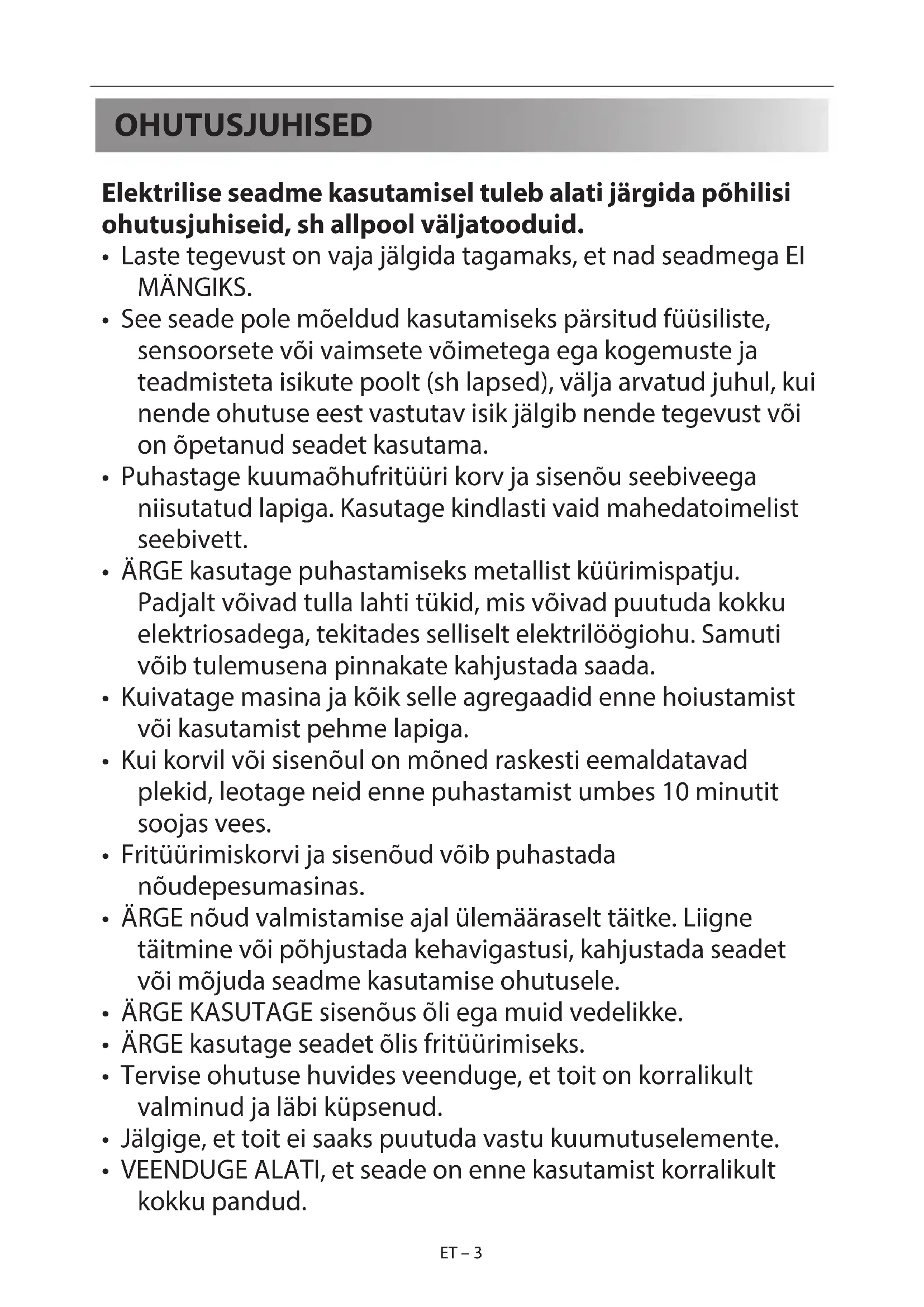 - VEENDUGE ALATI, et seade on enne kasutamist korralikult kokku pandud.ET ET – 3ET – 3 OHUTUSJUHISED Elektrilise seadme kasutamisel tuleb alati järgida põhilisi ohutusjuhiseid, sh allpool väljatooduid.