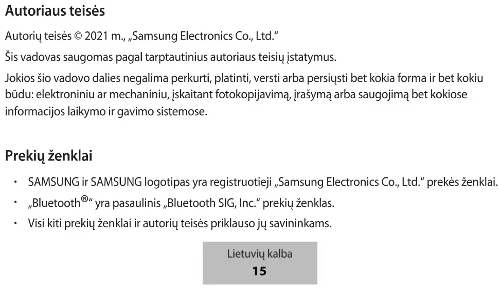 Samsung ei vastuta mistahes vigastuste või kahjude eest (ei lepinguliselt ega kaudselt, sealhulgas hooletus) mis võivad tekkida käesolevate hoiatuste ja juhiste täpselt järgimata jätmisest. Samsung vastutab üksnes surmajuhtumite või vigastuste eest, mille on põhjustanud Samsungi enda hooletus. Eesti 14Copyright Copyright © 2021 Samsung Electronics Co., Ltd. Antud kasutusjuhend on kaitstud rahvusvaheliste autoriõigustega. Kasutusjuhendi ühtki osa ei tohi reprodutseerida, levitada, tõlkida või edastada mitte mingil kujul ega mingite vahendite abil, olgu need siis elektroonilised või mehaanilised, sealhulgas kopeerimine, salvestamine või talletamine mis tahes andmete salvestamise ja esitamise süsteemis. Kaubamärgid
