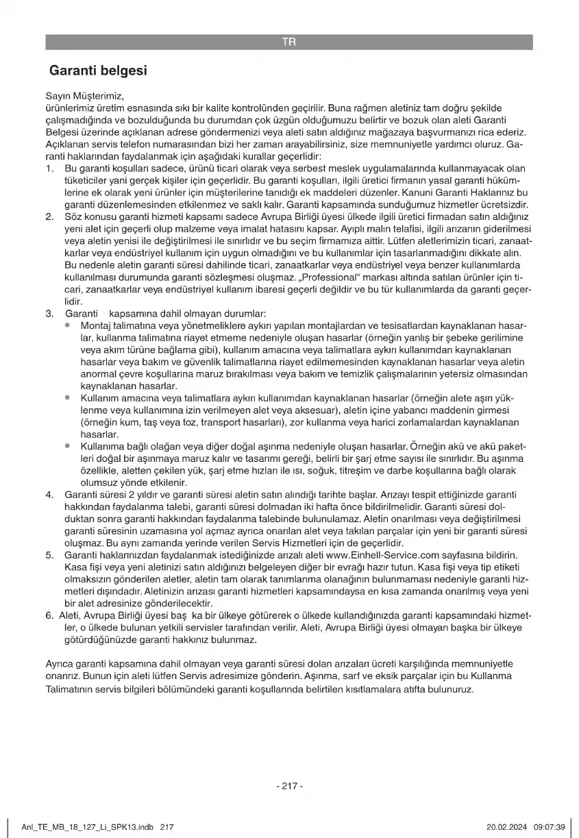 täidame garantii sealse teeninduspartneri kaudu. Euroopa Liidust väljaviimisel garantiinõudeõigus puudub. Enesestmõistetavalt kõrvaldame seadmel ka neid defekte, mis ei käi garantii alla või kui garantiiaeg on läbi, kuid sel juhul tuleb Teil kulud tasuda. Selleks saatke seade meie teeninduse. Kulu-/tarbe- ja puu- duolevate detailide osas juhime tähelepanu garantiipiirangutele vastavalt selles kasutusjuhendis antud hooldusteabele. Anl_TE_MB_18_127_Li_SPK13.indb 227Anl_TE_MB_18_127_Li_SPK13.indb 227 20.02.2024 09:07:4120.02.2024 09:07:41Jeff Dong/Product-Management Andreas Weichselgartner/General-Manager