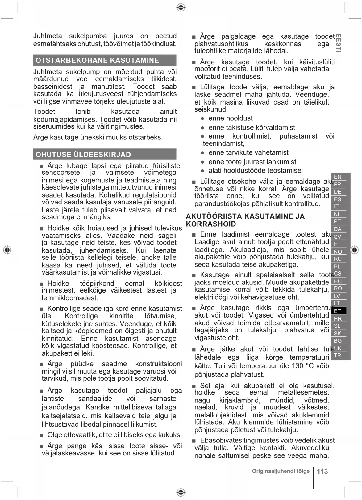 KORRASHOID ■ Enne laadimist eemaldage tootest aku. Laadige akut ainult tootja poolt ettenähtud laadijaga. Akulaadiaja, mis sobib ühele akupaketile võib põhjustada tulekahju, kui seda kasutada teise akupaketiga. ■ Kasutage ainult spetsiaalselt selle toote jaoks mõeldud akusid. Muude akupakettide kasutamise korral võib tekkida tulekahju, elektrilöögi või kehavigastuse oht. ■ Ärge kasutage rikkis ega ümbertehtud akut või toodet. Vigased või ümbertehtud akud võivad toimida ettearvamatult, mille tagajärjeks on tulekahju, plahvatus või vigastuste oht. ■ Ärge jätke akut või toodet lahtise tule lähedale ega liiga kõrge temperatuuri kätte. Tuli või temperatuur üle 130 °C võib põhjustada plahvatust. ■ Sel ajal kui akupakett ei ole kasutusel, hoidke seda eemal metallesemetest nagu kirjaklambrid, mündid, võtmed, naelad, kruvid ja muudest väikestest metallobjektidest, mis võivad akuklemmid lühistada. Aku klemmide lühistamine võib põhjustada põletust või tulekahju. ■ Ebasobivates tingimustes võib vedelik akust välja tulla. Vältige kontakti. Akuvedeliku nahale sattumisel peske see veega maha.114 Originaaljuhendi tõlge Vedeliku silma sattumisel pöörduge viivitamatult arsti poole. Väljapritsiv akuvedelik võib tekitada nahaärritust või -põletust. ■ Eemaldage tootest tühjad akud ja kõrvaldage need ohutult. JUHTMETA SUKELPUMBA OHUTUSJUHISED ■ Toote paigaldamisel veenduge, et aku oleks akukarbist eemaldatud. ■ Ärge laske akukastil veega kokku puutuda. Vesi võib sattuda elektroonilistesse osadesse ja/või akusse, mis võib põhjustada lühise, suurema tuleohu ja tõsiseid kehavigastusi. ■ Veenduge, et kõik ühendused oleksid lekkevabad. Kasutage ühenduskeermel keermeteipi või sobivat tihendusainet. ■ Keermestatud ühenduste pingutamisel ärge kasutage liigset jõudu, mis võib põhjustada kahjustusi. ■ Veenduge, et akukarp oleks kinnitatud stabiilsele toele kas klambrikonksu või seinakinnituskonksu abil. ■ Kui toodet on vaja tõsta või langetada, ühendage sobiv langetustross kandekäepidemega. Ärge tõstke toodet vooliku ega toitejuhtme abil. ■ Ärge kasutage toodet söövitavate, abrasiivsete, plahvatusohtlike ega ohtlike vedelike jaoks. Muud vedelikud kui vesi kahjustavad toodet, võivad põhjustada tuleohtu ja kasutajale füüsilisi vigastusi. ■ Ärge kasutage toodet joogivee puhul. ■ Ärge kasutage toodet ilma vedelikuta. Ärge laske pumbal kuivalt töötada. ■ Ärge kasutage toodet, kui inimesed on vees. ■ Ärge eemaldage voolikut, kui toode veel töötab. ■ Määrdeainete lekke tõttu võib tekkida vedeliku reostus. ■ Tootest väljutatud vesi võib muuta maapinna märjaks ja tekitada libisemisohtu. Pärast toote kasutamist puhastage väljavoolanud veest. ■ Ärge väljutage vett kohtadesse, kus on elektri- või kõrgepingeelemente, aktiivseid kemikaale või muid esemeid ja aineid, mis võivad veega segamisel ohtu tekitada. ■ Ärge jätke toodet kasutamise ajal järelevalveta. ■ Ärge jätke akukambrit vihma kätte ega hoidke toodet niisketes tingimustes. Toode on veekindel ainult siis, kui akukamber on suletud. Tootesse sattuv vesi suurendab elektrilöögiohtu. AKU LISAOHUTUSJUHISED Et vähendada tulekahju ja kehaliste vigastuste ohtu ning lühisest tulenevat toote kahjustamist, ärge kunagi kastke tööriista, akut või laadijat vedelikesse ega laske neil vedelikega kokku puutuda. Korrodeeruvad või elektrit juhtivad vedelikud, nagu soolvesi, teatud kemikaalid ja pleegitusained või pleegitusaineid sisaldavad tooted, võivad põhjustada lühist.