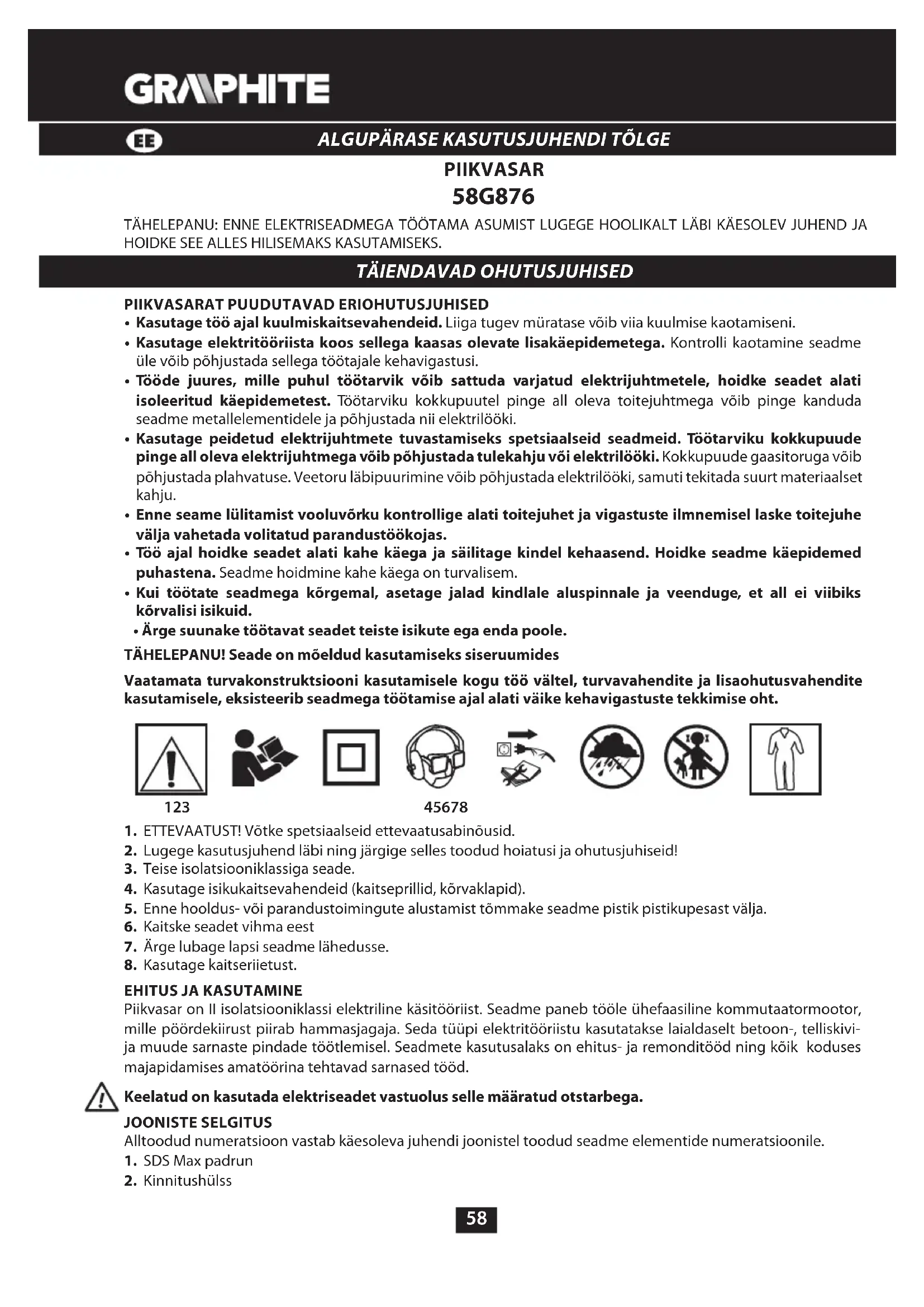 - Paigaldage süsiharjade katted (10) ja mootori kate (5). Pärast harjade vahetamist käivitage piikvasar ilma koormuseta ja oodake pisut, et harjad sobituksid kommutaatoriga. Usaldage süsiharjade vahetamine kvalitseeritud isikule, kes kasutab originaalvaruosi. Mistahes vead tuleb lasta parandada seadme tootja volitatud hooldusrmas.61 TEHNILISED PARAMEETRID NOMINAALSED ANDMED Piikvasar 58G876 Parameeter Väärtus Toitepinge 230 V AC Võrgusagedus 50 Hz Nominaalne võimsus 1200 W Löögisagedus 3350 min