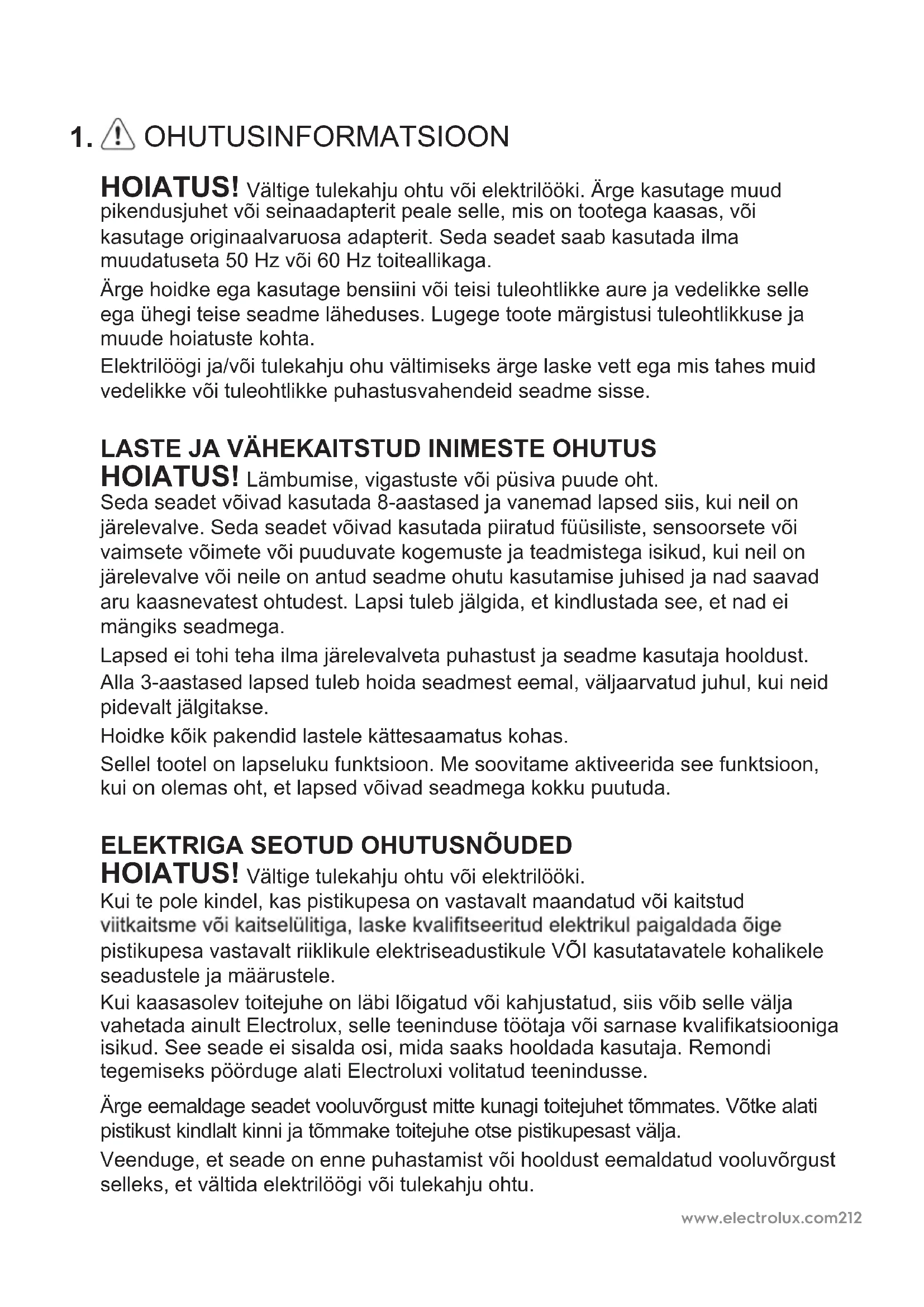 HOIATUS! Vältige tulekahju ohtu või elektrilööki. Kui te pole kindel, kas pistikupesa on vastavalt maandatud või kaitstud pistikupesa vastavalt riiklikule elektriseadustikule VÕI kasutatavatele kohalikele seadustele ja määrustele. Veenduge, et seade on enne puhastamist või hooldust eemaldatud vooluvõrgust selleks, et vältida elektrilöögi või tulekahju ohtu. Kui kaasasolev toitejuhe on läbi lõigatud või kahjustatud, siis võib selle välja vahetada ainult Electrolux, selle teeninduse töötaja või sarnase kvalifikatsiooniga isikud. See seade ei sisalda osi, mida saaks hooldada kasutaja. Remondi tegemiseks pöörduge alati Electroluxi volitatud teenindusse. Ärge eemaldage seadet vooluvõrgust mitte kunagi toitejuhet tõmmates. Võtke alati pistikust kindlalt kinni ja tõmmake toitejuhe otse pistikupesast välja.www.electrolux.com 213 OHUTUSABINÕUD ETTEVAATUST! Vältige raskeid vigastusi või surma. Ärge pange sõrmi ega esemeid seadme õhu väljavoolu võresse. Rikke korral (sädemed, põlemislõhn jne) peatage viivitamatult seadme töö, ühendage toitejuhe lahti ja võtke ühendust Electroluxi volitatud teenindusega. Ärge kasutage seadet märgade kätega. ETTEVAATUST! Vältige seadme või vara vigastusi või kahjustusi. Ärge suunake õhuvoolu kaminatele või teistele soojusallikatele, kuna see võib põhjustada ägenemist. Ärge ronige seadme peale ega pange sellele esemeid. Ärge riputage seadme külge esemeid. Ärge pange seadme peale vedelikuga täidetud anumaid. Lülitage seade toiteallikast VÄLJA, kui seda ei kasutata pikema aja jooksul. Ärge blokeerige või katke õhu sissevoolu võret või õhu väljavoolu võret. Veenduge, et kõik elektriseadmed/elektroonilised seadmed oleksid seadmest 30 cm kaugusel. Seadet tohib kasutada ainult koos tootja ja teeninduse töötaja poolt pakutud tarvikutega.