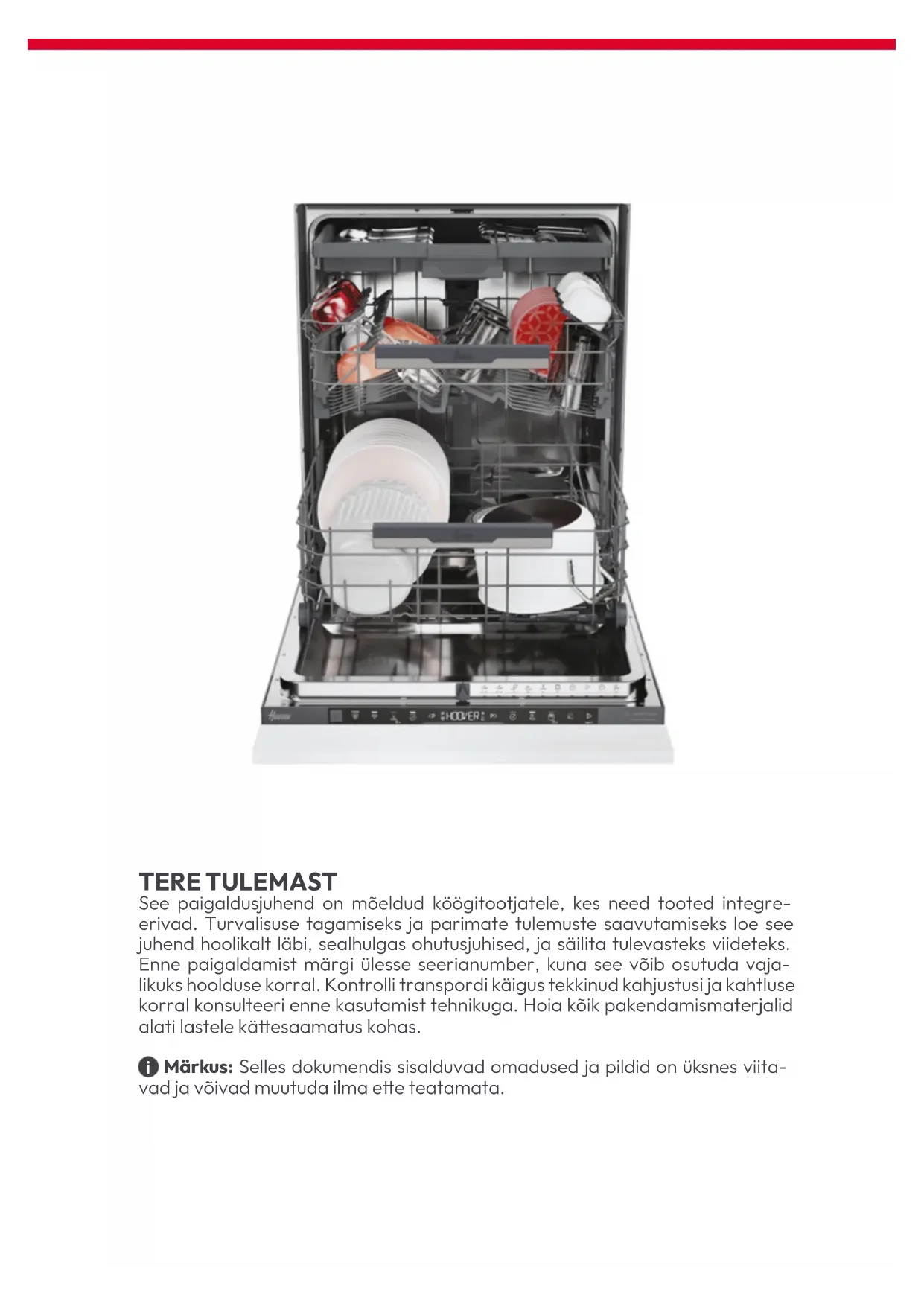 - Šis gaminys nepažeidžia baldų, kurie taip pat gali būti naudojami su nauju prietaisu.22TERE TULEMAST See paigaldusjuhend on mõeldud köögitootjatele, kes need tooted integre- erivad. Turvalisuse tagamiseks ja parimate tulemuste saavutamiseks loe see juhend hoolikalt läbi, sealhulgas ohutusjuhised, ja säilita tulevasteks viideteks. Enne paigaldamist märgi ülesse seerianumber, kuna see võib osutuda vaja- likuks hoolduse korral. Kontrolli transpordi käigus tekkinud kahjustusi ja kahtluse korral konsulteeri enne kasutamist tehnikuga. Hoia kõik pakendamismaterjalid alati lastele käesaamatus kohas. Märkus: Selles dokumendis sisalduvad omadused ja pildid on üksnes viita- vad ja võivad muutuda ilma ee teatamata.