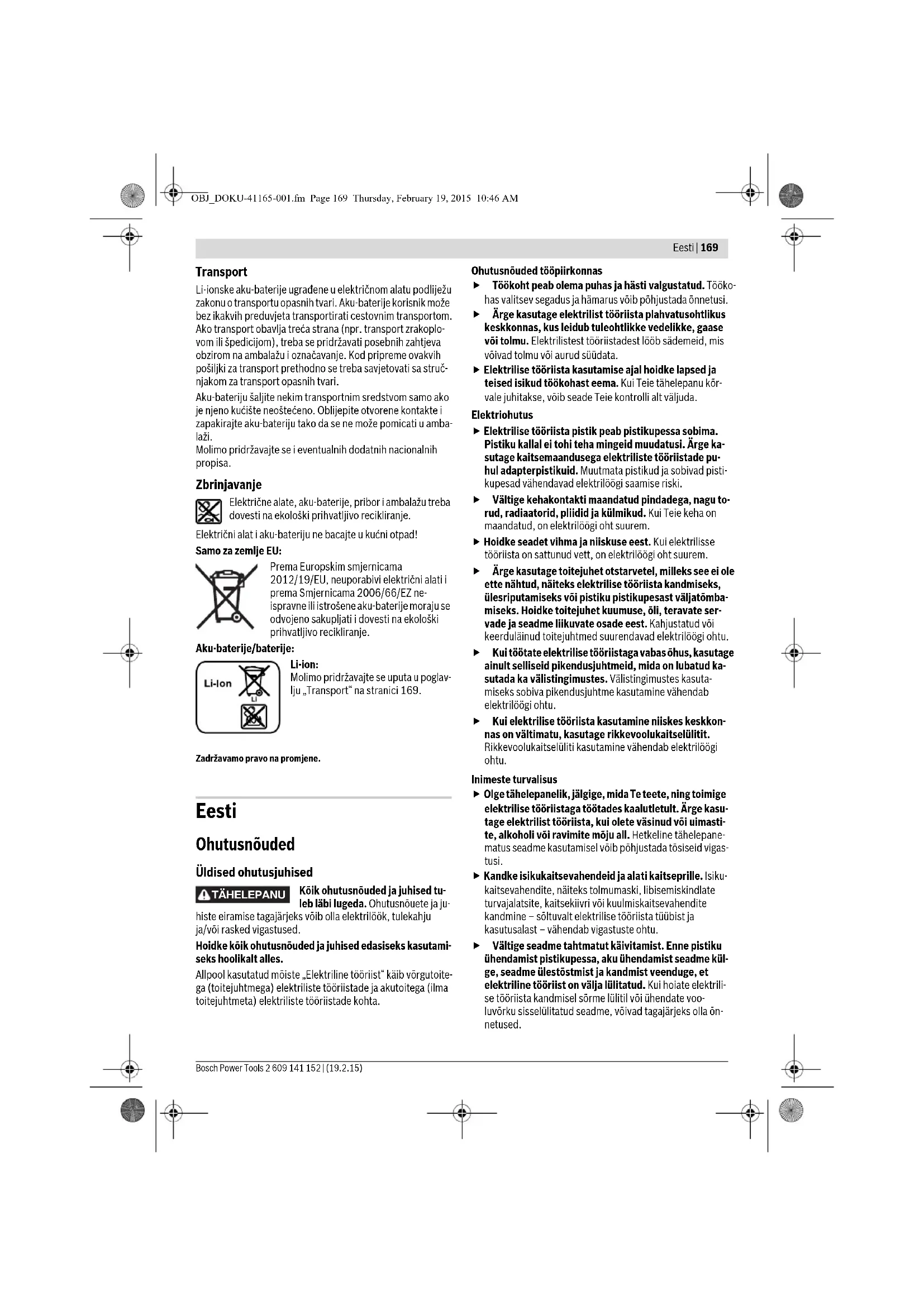 OBJ_BUCH-2221-001.book Page 168 Monday, February 16, 2015 11:15 AMEesti | 169 Bosch Power Tools 2 609 141 152 | (19.2.15) Transport Li-ionske aku-baterije ugrađene u električnom alatu podliježu zakonu o transportu opasnih tvari. Aku-baterije korisnik može bez ikakvih preduvjeta transportirati cestovnim transportom. Ako transport obavlja treća strana (npr. transport zrakoplo- vom ili špedicijom), treba se pridržavati posebnih zahtjeva obzirom na ambalažu i označavanje. Kod pripreme ovakvih pošiljki za transport prethodno se treba savjetovati sa struč- njakom za transport opasnih tvari. Aku-bateriju šaljite nekim transportnim sredstvom samo ako je njeno kućište neoštećeno. Oblijepite otvorene kontakte i zapakirajte aku-bateriju tako da se ne može pomicati u amba- laži. Molimo pridržavajte se i eventualnih dodatnih nacionalnih propisa. Zbrinjavanje Električne alate, aku-baterije, pribor i ambalažu treba dovesti na ekološki prihvatljivo recikliranje. Električni alat i aku-bateriju ne bacajte u kućni otpad! Samo za zemlje EU: Prema Europskim smjernicama 2012/19/EU, neuporabivi električni alati i prema Smjernicama 2006/66/EZ ne- ispravne ili istrošene aku-baterije moraju se odvojeno sakupljati i dovesti na ekološki prihvatljivo recikliranje. Aku-baterije/baterije: Li-ion: Molimo pridržavajte se uputa u poglav- lju „Transport“ na stranici 169. Zadržavamo pravo na promjene. Eesti Ohutusnõuded Üldised ohutusjuhised Kõik ohutusnõuded ja juhised tu- leb läbi lugeda. Ohutusnõuete ja ju- histe eiramise tagajärjeks võib olla elektrilöök, tulekahju ja/või rasked vigastused. Hoidke kõik ohutusnõuded ja juhised edasiseks kasutami- seks hoolikalt alles. Allpool kasutatud mõiste „Elektriline tööriist“ käib võrgutoite- ga (toitejuhtmega) elektriliste tööriistade ja akutoitega (ilma toitejuhtmeta) elektriliste tööriistade kohta. Ohutusnõuded tööpiirkonnas Töökoht peab olema puhas ja hästi valgustatud. Tööko- has valitsev segadus ja hämarus võib põhjustada õnnetusi. Ärge kasutage elektrilist tööriista plahvatusohtlikus keskkonnas, kus leidub tuleohtlikke vedelikke, gaase või tolmu. Elektrilistest tööriistadest lööb sädemeid, mis võivad tolmu või aurud süüdata. Elektrilise tööriista kasutamise ajal hoidke lapsed ja teised isikud töökohast eema. Kui Teie tähelepanu kõr- vale juhitakse, võib seade Teie kontrolli alt väljuda. Elektriohutus Elektrilise tööriista pistik peab pistikupessa sobima. Pistiku kallal ei tohi teha mingeid muudatusi. Ärge ka- sutage kaitsemaandusega elektriliste tööriistade pu- hul adapterpistikuid. Muutmata pistikud ja sobivad pisti- kupesad vähendavad elektrilöögi saamise riski. Vältige kehakontakti maandatud pindadega, nagu to- rud, radiaatorid, pliidid ja külmikud. Kui Teie keha on maandatud, on elektrilöögi oht suurem. Hoidke seadet vihma ja niiskuse eest. Kui elektrilisse tööriista on sattunud vett, on elektrilöögi oht suurem. Ärge kasutage toitejuhet otstarvetel, milleks see ei ole ette nähtud, näiteks elektrilise tööriista kandmiseks, ülesriputamiseks või pistiku pistikupesast väljatõmba- miseks. Hoidke toitejuhet kuumuse, õli, teravate ser- vade ja seadme liikuvate osade eest. Kahjustatud või keerduläinud toitejuhtmed suurendavad elektrilöögi ohtu. Kui töötate elektrilise tööriistaga vabas õhus, kasutage ainult selliseid pikendusjuhtmeid, mida on lubatud ka- sutada ka välistingimustes. Välistingimustes kasuta- miseks sobiva pikendusjuhtme kasutamine vähendab elektrilöögi ohtu. Kui elektrilise tööriista kasutamine niiskes keskkon- nas on vältimatu, kasutage rikkevoolukaitselülitit. Rikkevoolukaitselüliti kasutamine vähendab elektrilöögi ohtu. Inimeste turvalisus Olge tähelepanelik, jälgige, mida Te teete, ning toimige elektrilise tööriistaga töötades kaalutletult. Ärge kasu- tage elektrilist tööriista, kui olete väsinud või uimasti- te, alkoholi või ravimite mõju all. Hetkeline tähelepane- matus seadme kasutamisel võib põhjustada tõsiseid vigas- tusi. Kandke isikukaitsevahendeid ja alati kaitseprille. Isiku- kaitsevahendite, näiteks tolmumaski, libisemiskindlate turvajalatsite, kaitsekiivri või kuulmiskaitsevahendite kandmine – sõltuvalt elektrilise tööriista tüübist ja kasutusalast – vähendab vigastuste ohtu. Vältige seadme tahtmatut käivitamist. Enne pistiku ühendamist pistikupessa, aku ühendamist seadme kül- ge, seadme ülestõstmist ja kandmist veenduge, et elektriline tööriist on välja lülitatud. Kui hoiate elektrili- se tööriista kandmisel sõrme lülitil või ühendate voo- luvõrku sisselülitatud seadme, võivad tagajärjeks olla õn- netused. TÄHELEPANU OBJ_DOKU-41165-001.fm Page 169 Thursday, February 19, 2015 10:46 AM170 | Eesti 2 609 141 152 | (16.2.15) Bosch Power Tools Enne elektrilise tööriista sisselülitamist eemaldage selle küljest reguleerimis- ja mutrivõtmed. Seadme pöörleva osa küljes olev reguleerimis- või mutrivõti võib põhjustada vigastusi. Vältige ebatavalist kehaasendit. Võtke stabiilne töö- asend ja hoidke kogu aeg tasakaalu. Nii saate elektrilist tööriista ootamatutes olukordades paremini kontrollida. Kandke sobivat rõivastust. Ärge kandke laiu riideid ega ehteid. Hoidke juuksed, rõivad ja kindad seadme liiku- vatest osadest eemal. Lotendavad riided, ehted või pikad juuksed võivad sattuda seadme liikuvate osade vahele. Kui on võimalik paigaldada tolmueemaldus- ja tolmukogumisseadiseid, veenduge, et need on sead- mega ühendatud ja et neid kasutatakse õigesti. Tolmu- eemaldusseadise kasutamine vähendab tolmust põhjusta- tud ohte. Elektriliste tööriistade hoolikas käsitsemine ja kasutamine Ärge koormake seadet üle. Kasutage töö tegemiseks selleks ettenähtud elektrilist tööriista. Sobiva elektrili- se tööriistaga töötate ettenähtud jõudluspiirides efektiivsemalt ja ohutumalt. Ärge kasutage elektrilist tööriista, mille lüliti on rikkis