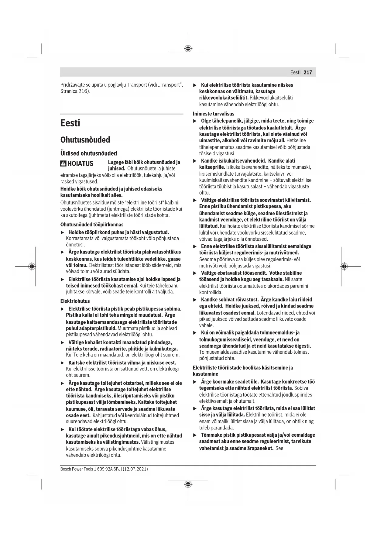 Käesolevas juhendis esitatud vibratsioonitase on mõõdetud standardse mõõtemeetodi järgi ja seda saab kasutada elektriliste tööriistade omavaheliseks võrdlemiseks. See sobib ka vibratsiooni esialgseks hindamiseks. Esitatud vibratsioonitase on tüüpiline elektrilise tööriista kasutamisel ettenähtud töödeks. Kui aga elektrilist tööriista kasutatakse muudeks töödeks, rakendatakse teisi tarvikuid või kui tööriista hooldus pole piisav, võib vibratsioonitase kõikuda. Sellest tingituna võib vibratsioon olla tööperioodil tervikuna tunduvalt suurem. Vibratsiooni täpseks hindamiseks tuleb arvesse võtta ka aega, mil seade oli välja lülitatud või küll sisse lülitatud, kuid tegelikult tööle rakendamata. Sellest tingituna võib vibratsioon olla tööperioodil tervikuna tunduvalt väiksem. Rakendage tööriista kasutaja kaitsmiseks vibratsiooni mõju eest täiendavaid kaitsemeetmeid, näiteks: hooldage tööriistu ja tarvikuid piisavalt, hoidke käed soojas, tagage sujuv töökorraldus. Paigaldus Aku laadimine u Kasutage üksnes tehnilistes andmetes loetletud laadimisseadmeid. Vaid need laadimisseadmed on ette nähtud teie elektrilises tööriistas kasutatud liitium- ioonaku laadimiseks. Suunis: Aku tarnitakse osaliselt laetult. Et tagada aku täit mahtuvust, laadige akut enne esmakordset kasutamist täiendavalt laadimisseadmes. Li-ioonakut võib laadida igal ajal, ilma et see lühendaks aku kasutusiga. Laadimise katkestamine ei kahjusta akut. Liitiumioon-akut kaitseb süvatühjenemise eest akuelementide elektrooniline kaitse "Electronic Cell Protection (ECP)". Tühja aku korral lülitab kaitselüliti seadme välja: vahetatav tööriist ei pöörle enam. u Pärast elektrilise tööriista automaatset väljalülitamist ärge vajutage enam lülitile (sisse/välja). Aku võib kahjustada saada. Järgige kasutusressursi ammendanud seadmete käitlemise juhiseid. Aku eemaldamine (vt jn A) Aku (4) eemaldamiseks vajutage lukustuse vabastamise nuppe (5) ja tõmmake aku elektrilisest tööriistast välja. Seejuures ärge rakendage jõudu. Aku laetuse taseme näidik LED Mahtuvus Pidev tuli 3x roheline 60–100% Pidev tuli 2x roheline 30–60% Pidev tuli 1x roheline 10–30% Aeglane vilkuv tuli 1x roheline 0–10% Kaitseseadise paigaldamine u Eemaldage aku seadmest enne mis tahes töid seadme kallal (nt hooldus, tarvikute vahetus jmt), samuti enne seadme transportimist ja hoiulepanekut. Lüliti (sisse/ välja) juhuslik käsitsemine toob kaasa vigastuste ohu. Märkus: Juhul kui lihvketas töötamise ajal murdub või kui kettakaitse/elektrilise tööriista kinnitusseadised saavad kahjustada, tuleb elektriline tööriist toimetada viivitamatult hoolduskeskusse; aadressid on toodud jaotises “Klienditeenindus ja kasutusalane nõustamine". Kaitsekate lihvimiseks u Kasutage lihvimisel alati lihvimiseks mõeldud kaitsekatet(7). Kaitsekate lõikamiseks u Seotud lihvimistarvikutega lõikamiseks kasutage alati lõikamiseks ette nähtud kaitsekatet (10). u Kivi lõikamisel tuleb tagada piisavalt tõhus tolmuimemine. Kaitsekatte paigaldamine (vt jn B) Asetage kaitsekate lõikamiseks (10) kaitsekattele lihvimiseks (7), nii et see kindlalt fikseerub. Kaitsekatte kohaleseadmine (vt jn B) Pöörake kaitsekate soovitud asendisse ja laske fikseeruda. Selleks ei ole vaja tööriista. Lihvimistarvikute paigaldamine u Eemaldage aku seadmest enne mis tahes töid seadme kallal (nt hooldus, tarvikute vahetus jmt), samuti enne seadme transportimist ja hoiulepanekut. Lüliti (sisse/ välja) juhuslik käsitsemine toob kaasa vigastuste ohu. u Ärge puudutage lihv- ja lõikekettaid enne, kui need on jahtunud. Kettad lähevad töötamisel väga kuumaks. Puhastage lihvspindel (8) ja kõik paigaldatavad osad. Lihvimistööriistade kinnitamiseks või vabastamiseks lükake spindli lukustusnuppu (2) ettepoole ja pöörake lihvspindli kinnitamiseks samal ajal tööriista. u Spindli lukustamise nupule vajutage üksnes siis, kui spindel seisab. Vastasel korral võib tööriist kahjustada saada. Lihv- /lõikeketas Pöörake tähelepanu lihvimistööriistade mõõtmetele. Augu läbimõõt peab tugiäärikuga sobima. Ärge kasutage adaptereid ega vähendusdetaile. Teemantlõikeketaste kasutamise korral veenduge, et kettal olev pöörlemissuuna nool ja elektrilise tööriista Bosch Power Tools 1 609 92A 6PJ | (12.07.2021)222 | Eesti pöörlemissuund (vt korpusel olevat pöörlemissuuna noolt) kattuvad. Paigalduse järjekord on näidatud jooniste lehel. Lihvimis-/lõikeketta vabastamiseks lükake spindli lukustusnuppu (2) ettepoole ja pöörake samal ajal lihvimis-/ lõikelõikeketast (12), et kinnitada lihvspindel (8) (vt jn C1). Eemaldage sisekuuskantvõtme (13) abil seibiga kinnituskruvi (11) ja võtke lihvimis-/lõikeketas (12) ära (vt jn C2). Lihvimis-/lõikeketta kinnitamiseks keerake seibiga kinnituskruvi (11) kinni. Pingutage kruvi sisekuuskantvõtmega (13) nii, et kruvi ketas toetub ühtlaselt lihvimis-/lõikekettale (12) (vt jn C3). Lükake spindli lukustusnupp (2) seejärel jälle tagasi (vt jn C4). u Pärast lihvimistarviku paigaldamist ja enne seadme sisselülitamist kontrollige, kas lihvimistarvik on korrektselt paigaldatud ja saab vabalt pöörelda. Veenduge, et lihvimistarvik ei puutu kokku kettakaitsme ega teiste osadega. Lubatud lihvimistarvikud Võite kasutada kõiki käesolevas kasutusjuhendis nimetatud lihvimistarvikuid. Kasutatud lihvimistarvikute lubatud pöörete arv [min