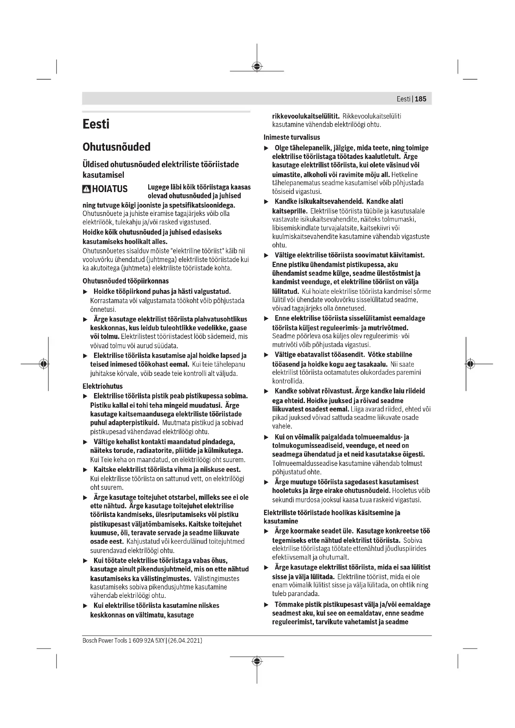 M6 2.71 3.61 4.52 4.8 5.42 6.02 7.22 8.13 9.7 13.6 16.2 M8 6.57 8.7 11 11.6 13.1 14.6 17.5 19.7 23 33 39 M10 13 17.5 22 23 26 29 35 39 47 65 78 M12 22.6 30 37.6 40 45 50 60 67 80 113 135 M14 36 48 60 65 72 79 95 107 130 180 215 M16 55 73 92 98 110 122 147 165 196 275 330 Savjeti Prije uvrtanja većih, duljih vijaka u tvrde materijale trebate s promjerom jezgre navoja prethodno bušiti na cca. 2/3 duljine vijka. Napomena: Pazite da metalni sitni dijelovi ne dospiju u električni alat. Kopča remena za nošenje Pomoću kopče remena za nošenje možete objesiti električni alat npr. na remen. U tom slučaju imate obje ruke slobodne i električni alat je u svakom trenutku spreman za držanje. Napomene za optimalno rukovanje aku-baterijom Zaštitite aku-bateriju od vlage i vode. Bosch Power Tools 1 609 92A 5XY | (26.04.2021)184 | Hrvatski Aku-bateriju čuvajte samo u prostoriji u kojoj je raspon temperature od –20 °C do 50 °C. Npr. aku-bateriju ljeti na ostavljajte u automobilu. Otvore za hlađenje aku-baterije redovito čistite mekim, čistim i suhim kistom. Bitno skraćenje vremena rada nakon punjenja pokazuje da je aku-baterija istrošena i da je treba zamijeniti. Pridržavajte se uputa za zbrinjavanje u otpad. Održavanje i servisiranje Održavanje i čišćenje u Prije svih radova na električnom alatu (npr. održavanje, zamjena alata, itd.), kao i kod njegovog transporta i spremanja, aku-bateriju treba izvaditi iz električnog alata. Kod nehotičnog aktiviranja prekidača za uključivanje/isključivanje postoji opasnost od ozljeda. u Električni alat i otvore za hlađenje održavajte čistima kako bi se moglo dobro i sigurno raditi. Zamjena ugljenih četkica (vidjetislikuD) Približno svaka 2 – 3 mjeseca provjerite duljinu ugljenih četkica i ako je potrebno, zamijenite obje ugljene četkice. Nikada nemojte zamijeniti samo jednu ugljenu četkicu! Napomena: Koristite samo ugljene četkice nabavljene preko tvrtke Bosch koje su namijenjene za vaš proizvod. – Otpustite kape (14) prikladnim odvijačem. – Zamijenite ugljene četkice (13) koje se nalaze pod pritiskom opruge i ponovno navrnite kape. Servisna služba i savjeti o uporabi Naša servisna služba će odgovoriti na vaša pitanja o popravku i održavanju vašeg proizvoda, kao i o rezervnim dijelovima. Crteže u rastavljenom obliku i informacije o rezervnim dijelovima možete naći i na našoj adresi: www.bosch-pt.com Tim Bosch savjetnika o uporabi rado će odgovoriti na vaša pitanja o našim proizvodima i njihovom priboru. U slučaju upita ili naručivanja rezervnih dijelova, molimo vas obavezno navedite 10‑znamenkasti kataloški broj s tipske pločice proizvoda. Hrvatski Robert Bosch d.o.o PT/SHR-BSC Kneza Branimira 22 10040 Zagreb Tel.: +385 12 958 051 Fax: +385 12 958 050 E-Mail: RBKN-bsc@hr.bosch.com www.bosch.hr Ostale adrese servisa možete pronaći na: www.bosch-pt.com/serviceaddresses Transport Litij-ionske aku-baterije podliježu zakonu o transportu opasnih tvari. Korisnik bez ikakvih preduvjeta može transportirati aku-baterije cestovnim transportom. Ako transport obavlja treća strana (npr. transport zrakoplovom ili špedicija), treba se pridržavati posebnih zahtjeva za ambalažu i označavanje. Kod pripreme ovakvih pošiljki za transport prethodno se treba savjetovati sa stručnjakom za transport opasnih tvari. Aku-bateriju šaljite nekim transportnim sredstvom samo ako je njezino kućište neoštećeno. Oblijepite otvorene kontakte i zapakirajte aku-bateriju tako da se ne može pomicati u ambalaži. Pridržavajte se i eventualnih dodatnih nacionalnih propisa. Zbrinjavanje Električne alate, aku-baterije, pribor i ambalažu treba dovesti na ekološki prihvatljivo recikliranje. Električni alat i aku-baterije/baterije ne bacajte u kućni otpad! Samo za zemljeEU: Sukladno europskoj Direktivi 2012/19/EU električni alati koji više nisu uporabivi i sukladno europskoj Direktivi 2006/66/EZ neispravne ili istrošene aku-baterije moraju se odvojeno sakupljati i dovesti na ekološki prihvatljivo recikliranje. Aku-baterije/baterije: Litij-ionske: Pridržavajte se uputa u poglavlju Transport (vidi „Transport“, Stranica184). Održavanje i čišćenje u Prije svih radova na električnom alatu (npr. održavanje, zamjena alata, itd.), kao i kod njegovog transporta i spremanja, aku-bateriju treba izvaditi iz električnog alata. Kod nehotičnog aktiviranja prekidača za uključivanje/isključivanje postoji opasnost od ozljeda. u Električni alat i otvore za hlađenje održavajte čistima kako bi se moglo dobro i sigurno raditi. Zamjena ugljenih četkica (vidjetislikuD) Približno svaka 2 – 3 mjeseca provjerite duljinu ugljenih četkica i ako je potrebno, zamijenite obje ugljene četkice. Nikada nemojte zamijeniti samo jednu ugljenu četkicu! Napomena: Koristite samo ugljene četkice nabavljene preko tvrtke Bosch koje su namijenjene za vaš proizvod. – Otpustite kape (14) prikladnim odvijačem. – Zamijenite ugljene četkice (13) koje se nalaze pod pritiskom opruge i ponovno navrnite kape. 1 609 92A 5XY | (26.04.2021) Bosch Power ToolsEesti | 185 Eesti Ohutusnõuded Üldised ohutusnõuded elektriliste tööriistade kasutamisel HOIATUS Lugege läbi kõik tööriistaga kaasas olevad ohutusnõuded ja juhised ning tutvuge kõigi jooniste ja spetsifikatsioonidega. Ohutusnõuete ja juhiste eiramise tagajärjeks võib olla elektrilöök, tulekahju ja/või rasked vigastused. Hoidke kõik ohutusnõuded ja juhised edasiseks kasutamiseks hoolikalt alles. Ohutusnõuetes sisalduv mõiste "elektriline tööriist" käib nii vooluvõrku ühendatud (juhtmega) elektriliste tööriistade kui ka akutoitega (juhtmeta) elektriliste tööriistade kohta. Ohutusnõuded tööpiirkonnas u Hoidke tööpiirkond puhas ja hästi valgustatud. Korrastamata või valgustamata töökoht võib põhjustada õnnetusi. u Ärge kasutage elektrilist tööriista plahvatusohtlikus keskkonnas, kus leidub tuleohtlikke vedelikke, gaase või tolmu. Elektrilistes