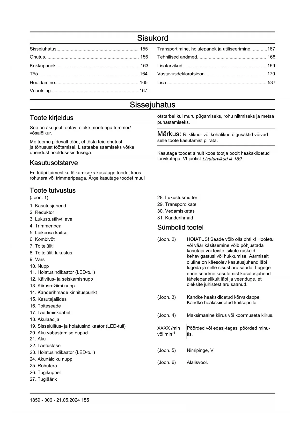 - Lisa Sissejuhatus Toote kirjeldus See on aku jõul töötav, elektrimootoriga trimmer/ võsalõikur. Me teeme pidevalt tööd, et tõsta teie ohutust ja tõhusust töötamisel. Lisateabe saamiseks võtke ühendust hooldusesindusega. Kasutusotstarve Eri tüüpi taimestiku lõikamiseks kasutage toodet koos rohutera või trimmeripeaga. Ärge kasutage toodet muul otstarbel kui muru pügamiseks, rohu niitmiseks ja metsa puhastamiseks. Märkus: Riiklikud- või kohalikud õigusaktid võivad selle toote kasutamist piirata. Kasutage toodet ainult koos tootja poolt heakskiidetud tarvikutega. Vt jaotist Lisatarvikud lk 169 p. 537