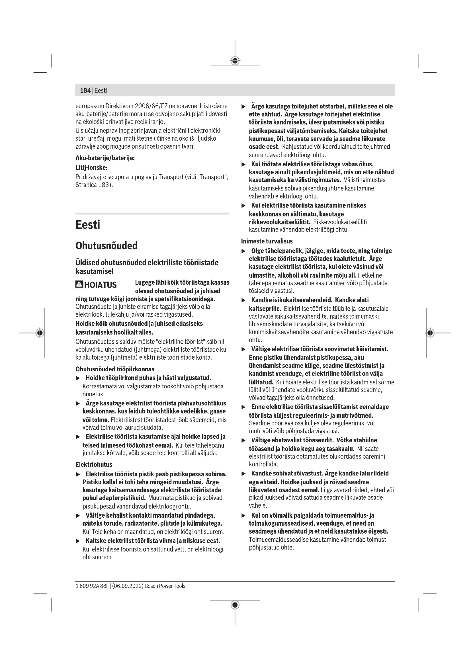 Skinite pravokutnu brusnu ploču(12). Posebne brusne ploče Isporučenu brusnu ploču (10) možete zamijeniti posebnom brusnom pločom koja se može kupiti kao pribor. Montaža posebne brusne ploče vrši se prema zamjeni isporučene brusne ploče. Stavljanje i skidanje dotične brusne ploče vrši se prema zamjeni originalne brusne ploče. Rad posebnih brusnih ploča dopušten je samo s montiranom stražnjom brusnom pločom(11). Nastavak za brušenje lamela (vidjeti sliku H) Uporaba nastavka za brušenje lamela (18) omogućuje vam obradu na posebno teško pristupačnim mjestima, npr. lamela na prozorima, ormarima ili vratima. Brusni jezičac, plosnati (vidjeti sliku I) Plosnati brusni jezičac (20) omogućuje vam obradu uskih utora i uskih međuprostora. Brusni list za brusni jezičac(19) montira se kao prednji brusni list(17). Brusni jezičac, ovalni (vidjeti sliku I) Ovalni brusni jezičac (21) omogućuje vam obradu zaobljenja i šupljina ili površina zaobljenih prema unutra, npr. na namještaju, rukohvatima ili radijatorima. Brusni list za brusni jezičac(19) montira se kao prednji brusni list(17). 1 609 92A 88F | (06.09.2022) Bosch Power ToolsHrvatski | 183 Rad Puštanje u rad Uključivanje/isključivanje u Provjerite možete li pritisnuti prekidač za uključivanje/isključivanje bez otpuštanja ručke. Za uključivanje električnog alata pritisnite prekidač za uključivanje/isključivanje (2) udesno u položaj „I“. Za isključivanje električnog alata pritisnite prekidač za uključivanje/isključivanje (2) ulijevo u položaj „O“. Zaštita od preopterećenja ovisna o temperaturi Kod namjenske uporabe se električni alat ne može preopteretiti. Kod prevelikog opterećenja ili prekoračenja dopuštene temperature aku-baterije isključuje se elektronika električnog alata sve dok se ne ponovno ne vrati u optimalno područje radne temperature. Prethodno biranje broja oscilacija Kotačićem za prethodno biranje broja oscilacija (1) možete i tijekom rada prethodno odabrati potreban broj oscilacija. Potreban broj oscilacija ovisi o materijalu i radnim uvjetima te se može odrediti praktičnim pokusom. Upute za rad u Prije svih radova na električnom alatu (npr. održavanje, zamjena alata, itd.), kao i kod njegovog transporta i spremanja, aku-bateriju treba izvaditi iz električnog alata. Kod nehotičnog aktiviranja prekidača za uključivanje/isključivanje postoji opasnost od ozljeda. u Prije odlaganja električnog alata pričekajte da se zaustavi. Kod poliranja odaberite manji broj okretaja kako biste izbjegli prekomjerno zagrijavanje površine. Učinak skidanja materijala s površine kod brušenja u biti se određuje izborom brusnog lista kao i prethodnim biranjem broja oscilacija (1). Samo besprijekorni brusni listovi daju dobar učinak brušenja i čuvaju električni alat. Pazite na jednolični pritisak kako bi se produljio vijek trajanja brusnih listova. Prekomjernim povećanjem pritiska ne povećava se učinak brušenja, nego dolazi do jačeg trošenja električnog alata i brusnog lista. Za precizno brušenje kutova, rubova i teško pristupačnih mjesta možete raditi i samo s vrhom ili rubom brusne ploče. Brusni list kojim je obrađivan metal ne koristite više za obradu drugih materijala. Koristite samo originalni Bosch pribor za brušenje. Održavanje i servisiranje Održavanje i čišćenje u Prije svih radova na električnom alatu (npr. održavanje, zamjena alata, itd.), kao i kod njegovog transporta i spremanja, aku-bateriju treba izvaditi iz električnog alata. Kod nehotičnog aktiviranja prekidača za uključivanje/isključivanje postoji opasnost od ozljeda. u Električni alat i otvore za hlađenje održavajte čistima kako bi se moglo dobro i sigurno raditi. Servisna služba i savjeti o uporabi Naša servisna služba će odgovoriti na vaša pitanja o popravku i održavanju vašeg proizvoda, kao i o rezervnim dijelovima. Crteže u rastavljenom obliku i informacije o rezervnim dijelovima možete naći i na našoj adresi: www.bosch-pt.com Tim Bosch savjetnika o uporabi rado će odgovoriti na vaša pitanja o našim proizvodima i njihovom priboru. U slučaju upita ili naručivanja rezervnih dijelova, molimo vas obavezno navedite 10‑znamenkasti kataloški broj s tipske pločice proizvoda. Hrvatski Robert Bosch d.o.o PT/SHR-BSC Kneza Branimira 22 10040 Zagreb Tel.: +385 12 958 051 Fax: +385 12 958 050 E-Mail: RBKN-bsc@hr.bosch.com www.bosch.hr Ostale adrese servisa možete pronaći na: www.bosch-pt.com/serviceaddresses Transport Preporučene litij-ionske aku-baterije podliježu zakonu o transportu opasnih tvari. Korisnik bez ikakvih preduvjeta može transportirati aku-baterije cestovnim transportom. Ako transport obavlja treća strana (npr. transport zrakoplovom ili špedicija), treba se pridržavati posebnih zahtjeva za ambalažu i označavanje. Kod pripreme ovakvih pošiljki za transport prethodno se treba savjetovati sa stručnjakom za transport opasnih tvari. Aku-bateriju šaljite nekim transportnim sredstvom samo ako je njezino kućište neoštećeno. Oblijepite otvorene kontakte i zapakirajte aku-bateriju tako da se ne može pomicati u ambalaži. Pridržavajte se i eventualnih dodatnih nacionalnih propisa. Zbrinjavanje Električne alate, aku-baterije, pribor i ambalažu treba dovesti na ekološki prihvatljivo recikliranje. Električni alat i aku-baterije/baterije ne bacajte u kućni otpad! Samo za zemljeEU: U skladu s europskom Direktivom 2012/19/EU o električnim i elektroničkim starim uređajima i njihovom provedbom u nacionalno pravo neupotrebljivi električni alati i u skladu s Bosch Power Tools 1 609 92A 88F | (06.09.2022)184 | Eesti europskom Direktivom 2006/66/EZ neispravne ili istrošene aku-baterije/baterije moraju se odvojeno sakupljati i dovesti na ekološki prihvatljivo recikliranje. U slučaju nepravilnog zbrinjavanja električni i elektronički stari uređaji mogu imati štetne učinke na okoliš i ljudsko zdravlje zbog moguće prisutnosti opas