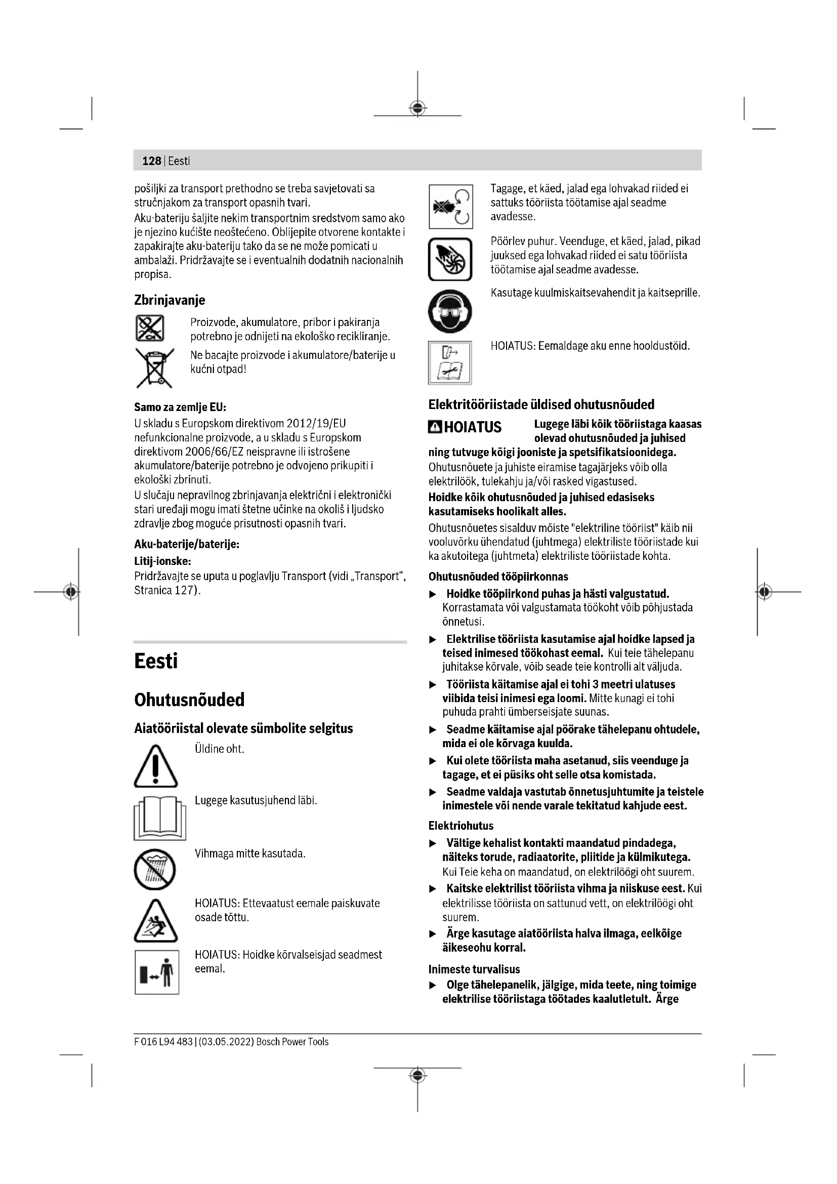 Simboli Sljedeći simboli važni su za čitanje i razumijevanje priručnika za uporabu. Zapamtite simbole i njihovo značenje. Ispravno tumačenje simbola pomoći će vam da bolje i sigurnije rabite proizvod. Simbol Značenje Smjer kretanja Uključivanje F 016 L94 483 | (03.05.2022) Bosch Power ToolsHrvatski | 127 Simbol Značenje Isključivanje Simbol Značenje CLICK! Čujni zvuk Pribor Otklanjanje pogrešaka Sljedeća tablica prikazuje simptome pogrešaka i kako riješiti problem ako stroj ne radi ispravno. Ako time ne uspijete locirati i otkloniti problem, obratite se servisnoj radionici. Pozor: Isključite uređaj prije otklanjanja pogreške. Pozor: U slučaju nezgode ili loma alata odmah zaustavite stroj i izvadite akumulator. Simptom Mogući uzrok Rješenje Vrtni uređaj ne radi Akumulator je ispražnjen Napunite akumulator Akumulator nije ispravno umetnut Ispravno umetnite akumulator (vidi sliku C) Akumulator je prehladan/pretopao Pustite akumulator da se zagrije/ohladi. Uvijek pokrenite proizvod s malom brzinom vrtnje Vrtni uređaj je neispravan Obratite se servisnoj službi Vrtni uređaj radi s prekidima Sklopka za uključivanje/isključivanje je neispravna Obratite se servisnoj službi Regulator brzine zračne struje je neispravan Obratite se servisnoj službi Jake vibracije/buka Vrtni uređaj je neispravan Obratite se servisnoj službi Prekratko trajanje rada po punjenju akumulatora Akumulator se nije dulje vrijeme rabio ili se rabio samo nakratko Potpuno napunite akumulator Akumulator je u kvaru ili neispravan Zamijenite akumulator Vrtni uređaj ne puše Sapnica je blokirana Oslobodite sapnicu Smanjen protok zraka Ulaz zraka blokiran Oslobodite ulaz zraka Akumulator je prehladan Uvijek pokrenite proizvod s malom brzinom vrtnje Sapnicu nije moguće montirati Pogrešna montaža Ispravno montirajte sapnicu (vidi sliku B) Održavanje i servisiranje Održavanje, čišćenje i skladištenje u Popravak proizvoda prepustite samo kvalificiranom stručnom osoblju i samo s originalnim rezervnim dijelovima. Time će se osigurati da ostane zadržana sigurnost. u Nikada ne servisirajte oštećene komplete baterija. Servisiranje kompleta baterija smiju obavljati isključivo proizvođači i ovlašteni serviseri. Servisna služba i savjeti o uporabi Naša servisna služba će odgovoriti na vaša pitanja o popravku i održavanju vašeg proizvoda, kao i o rezervnim dijelovima. Crteže u rastavljenom obliku i informacije o rezervnim dijelovima možete naći i na našoj adresi: www.bosch-pt.com Tim Bosch savjetnika o uporabi rado će odgovoriti na vaša pitanja o našim proizvodima i njihovom priboru. U slučaju upita ili naručivanja rezervnih dijelova, molimo vas obavezno navedite 10‑znamenkasti kataloški broj s tipske pločice proizvoda. Hrvatski Robert Bosch d.o.o PT/SHR-BSC Kneza Branimira 22 10040 Zagreb Tel.: +385 12 958 051 Fax: +385 12 958 050 E-Mail: RBKN-bsc@hr.bosch.com www.bosch.hr Ostale adrese servisa možete pronaći na: www.bosch-pt.com/serviceaddresses Transport Preporučene litij-ionske aku-baterije podliježu zakonu o transportu opasnih tvari. Korisnik bez ikakvih preduvjeta može transportirati aku-baterije cestovnim transportom. Ako transport obavlja treća strana (npr. transport zrakoplovom ili špedicija), treba se pridržavati posebnih zahtjeva za ambalažu i označavanje. Kod pripreme ovakvih Bosch Power Tools F 016 L94 483 | (03.05.2022)128 | Eesti pošiljki za transport prethodno se treba savjetovati sa stručnjakom za transport opasnih tvari. Aku-bateriju šaljite nekim transportnim sredstvom samo ako je njezino kućište neoštećeno. Oblijepite otvorene kontakte i zapakirajte aku-bateriju tako da se ne može pomicati u ambalaži. Pridržavajte se i eventualnih dodatnih nacionalnih propisa. Zbrinjavanje Proizvode, akumulatore, pribor i pakiranja potrebno je odnijeti na ekološko recikliranje. Ne bacajte proizvode i akumulatore/baterije u kućni otpad! Samo za zemljeEU: U skladu s Europskom direktivom 2012/19/EU nefunkcionalne proizvode, a u skladu s Europskom direktivom 2006/66/EZ neispravne ili istrošene akumulatore/baterije potrebno je odvojeno prikupiti i ekološki zbrinuti. U slučaju nepravilnog zbrinjavanja električni i elektronički stari uređaji mogu imati štetne učinke na okoliš i ljudsko zdravlje zbog moguće prisutnosti opasnih tvari. Aku-baterije/baterije: Litij-ionske: Pridržavajte se uputa u poglavlju Transport (vidi „Transport“, Stranica127). Eesti Ohutusnõuded Aiatööriistal olevate sümbolite selgitus Üldine oht. Lugege kasutusjuhend läbi. Vihmaga mitte kasutada. HOIATUS: Ettevaatust eemale paiskuvate osade tõttu. HOIATUS: Hoidke kõrvalseisjad seadmest eemal. Tagage, et käed, jalad ega lohvakad riided ei sattuks tööriista töötamise ajal seadme avadesse. Pöörlev puhur. Veenduge, et käed, jalad, pikad juuksed ega lohvakad riided ei satu tööriista töötamise ajal seadme avadesse. Kasutage kuulmiskaitsevahendit ja kaitseprille. HOIATUS: Eemaldage aku enne hooldustöid. Elektritööriistade üldised ohutusnõuded HOIATUS Lugege läbi kõik tööriistaga kaasas olevad ohutusnõuded ja juhised ning tutvuge kõigi jooniste ja spetsifikatsioonidega. Ohutusnõuete ja juhiste eiramise tagajärjeks võib olla elektrilöök, tulekahju ja/või rasked vigastused. Hoidke kõik ohutusnõuded ja juhised edasiseks kasutamiseks hoolikalt alles. Ohutusnõuetes sisalduv mõiste "elektriline tööriist" käib nii vooluvõrku ühendatud (juhtmega) elektriliste tööriistade kui ka akutoitega (juhtmeta) elektriliste tööriistade kohta. Ohutusnõuded tööpiirkonnas u Hoidke tööpiirkond puhas ja hästi valgustatud. Korrastamata või valgustamata töökoht võib põhjustada õnnetusi. u Elektrilise tööriista kasutamise ajal hoidke lapsed ja teised inimesed töökohast eemal. Kui teie tähelepanu juhitakse kõrvale, võib seade teie kontrolli alt väljuda. u Tööriista käitamise ajal ei tohi 3 meetri ulatuses viibida teisi inimesi ega loomi
