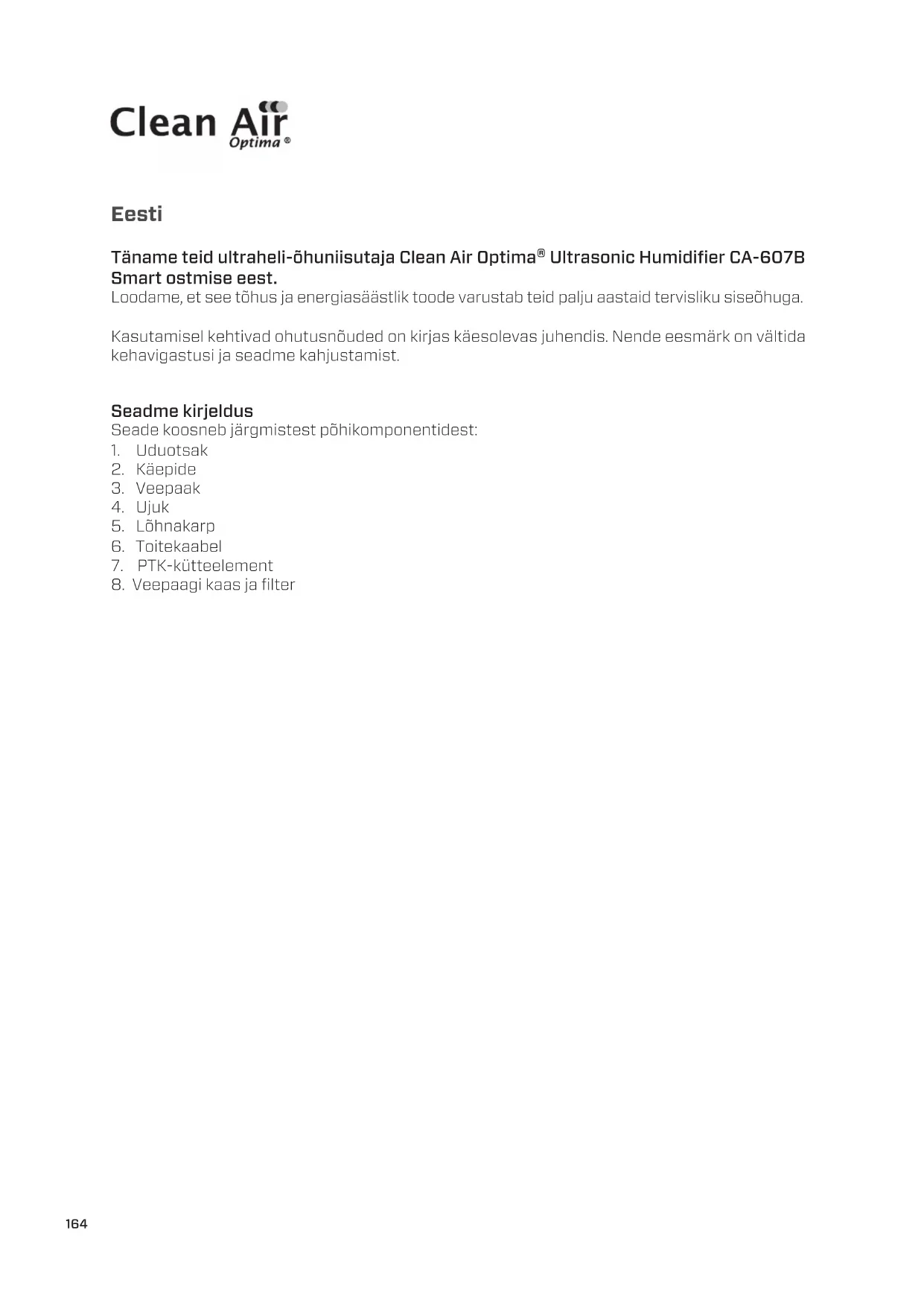 CA-607B Smart / Ekraan164 Eesti Täname teid ultraheli-õhuniisutaja Clean Air Optima® Ultrasonic Humidifier CA-607B Smart ostmise eest. Loodame, et see tõhus ja energiasäästlik toode varustab teid palju aastaid tervisliku siseõhuga. Kasutamisel kehtivad ohutusnõuded on kirjas käesolevas juhendis. Nende eesmärk on vältida kehavigastusi ja seadme kahjustamist. Seadme kirjeldus Seade koosneb järgmistest põhikomponentidest: