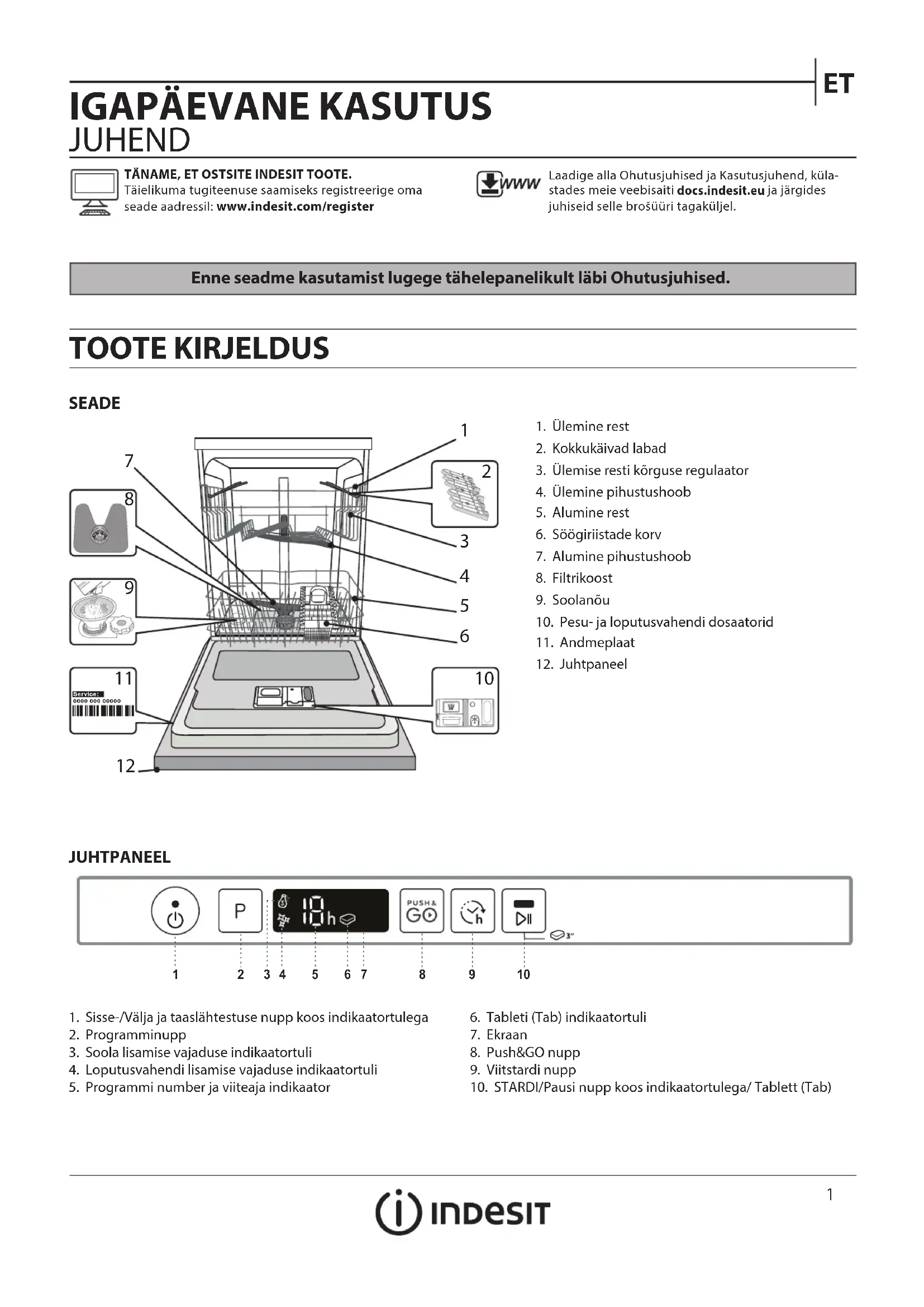 JUHEND Enne seadme kasutamist lugege tähelepanelikult läbi Ohutusjuhised.SEADE TOOTE KIRJELDUS JUHTPANEELTÄNAME, ET OSTSITE INDESIT TOOTE. Täielikuma tugiteenuse saamiseks registreerige omaseade aadressil: www.indesit.com/registerLaadige alla Ohutusjuhised ja Kasutusjuhend, küla-stades meie veebisaiti docs.indesit.eu ja järgides juhiseid selle brošüüri tagaküljel.1. Ülemine rest2. Kokkukäivad labad3. Ülemise resti kõrguse regulaator4. Ülemine pihustushoob5. Alumine rest6. Söögiriistade korv7. Alumine pihustushoob8. Filtrikoost9. Soolanõu10. Pesu- ja loputusvahendi dosaatorid11. Andmeplaat12. Juhtpaneel0000 000 00000 Service: