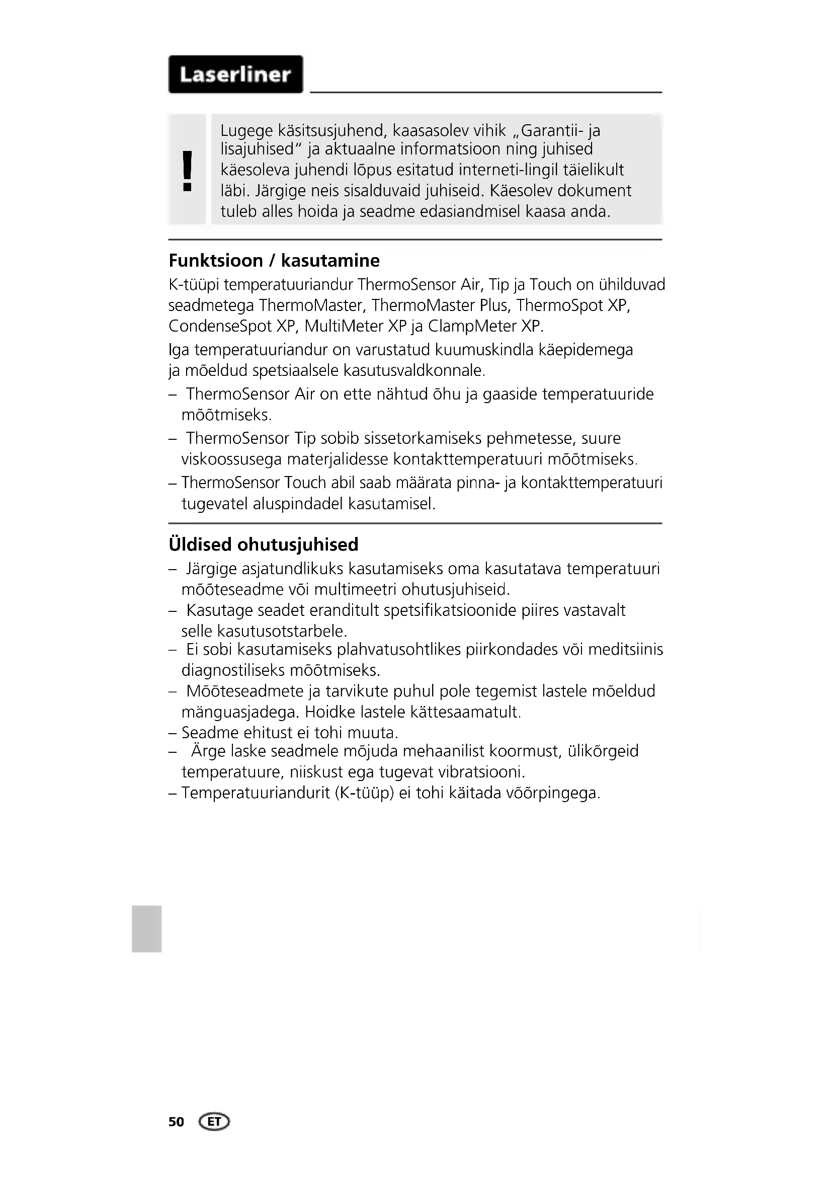 ThermoSensor Touch abil saab määrata pinna- ja kontakttemperatuuri tugevatel aluspindadel kasutamisel. Üldised ohutusjuhised – Järgige asjatundlikuks kasutamiseks oma kasutatava temperatuuri mõõteseadme või multimeetri ohutusjuhiseid. – Kasutage seadet eranditult spetsikatsioonide piires vastavalt selle kasutusotstarbele. – Ei sobi kasutamiseks plahvatusohtlikes piirkondades või meditsiinis diagnostiliseks mõõtmiseks. – Mõõteseadmete ja tarvikute puhul pole tegemist lastele mõeldud mänguasjadega. Hoidke lastele kättesaamatult. – Seadme ehitust ei tohi muuta. – Ärge laske seadmele mõjuda mehaanilist koormust, ülikõrgeid temperatuure, niiskust ega tugevat vibratsiooni. – Temperatuuriandurit (K-tüüp) ei tohi käitada võõrpingega. Funktsioon / kasutamine Lugege käsitsusjuhend, kaasasolev vihik „Garantii- ja lisajuhised“ ja aktuaalne informatsioon ning juhised käesoleva juhendi lõpus esitatud interneti-lingil täielikult läbi. Järgige neis sisalduvaid juhiseid. Käesolev dokument tuleb alles hoida ja seadme edasiandmisel kaasa anda.