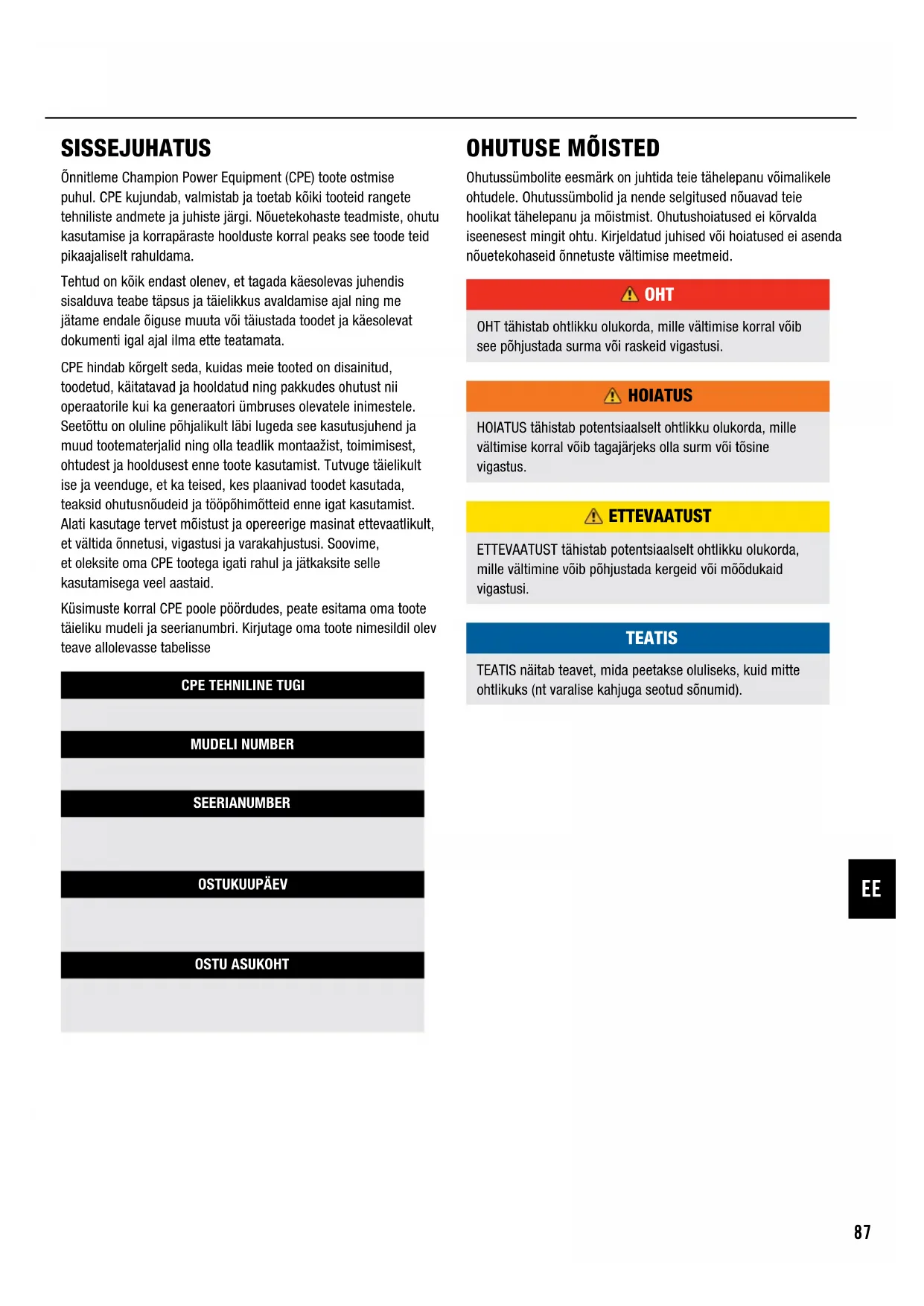 Vain kaksi kaukosäädintä voi olla yhden generaattorin käytössä kerrallaan. NOTE Kaukosäätimen akun vaihtaminen ei välttämättä edellytä, että käyttäjä nollaa kaukosäätimen. NOTE Rinnakkaiskäyttö Kahta (2) Champion-mallia voidaan käyttää samanaikaisesti kokonaistuoton lisäämiseksi. Rinnakkaiskäyttöä varten tarvitaan Champion- rinnakkaissarja (lisävaruste). www.championpowerequipment.eu Yksityiskohtaiset ohjeet kytkettyjen generaattoreiden rinnakkaisasennuksesta ovat sarjan omistajan käsikirjassa ja käyttöohjeissa.OHUTUSE MÕISTED Ohutussümbolite eesmärk on juhtida teie tähelepanu võimalikele ohtudele. Ohutussümbolid ja nende selgitused nõuavad teie hoolikat tähelepanu ja mõistmist. Ohutushoiatused ei kõrvalda iseenesest mingit ohtu. Kirjeldatud juhised või hoiatused ei asenda nõuetekohaseid õnnetuste vältimise meetmeid. OHT OHT tähistab ohtlikku olukorda, mille vältimise korral võib see põhjustada surma või raskeid vigastusi. HOIATUS HOIATUS tähistab potentsiaalselt ohtlikku olukorda, mille vältimise korral võib tagajärjeks olla surm või tõsine vigastus. ETTEVAATUST ETTEVAATUST tähistab potentsiaalselt ohtlikku olukorda, mille vältimine võib põhjustada kergeid või mõõdukaid vigastusi. TEATIS TEATIS näitab teavet, mida peetakse oluliseks, kuid mitte ohtlikuks (nt varalise kahjuga seotud sõnumid). SISSEJUHATUS Õnnitleme Champion Power Equipment (CPE) toote ostmise puhul. CPE kujundab, valmistab ja toetab kõiki tooteid rangete tehniliste andmete ja juhiste järgi. Nõuetekohaste teadmiste, ohutu kasutamise ja korrapäraste hoolduste korral peaks see toode teid pikaajaliselt rahuldama.Tehtud on kõik endast olenev, et tagada käesolevas juhendis sisalduva teabe täpsus ja täielikkus avaldamise ajal ning me jätame endale õiguse muuta või täiustada toodet ja käesolevat dokumenti igal ajal ilma ette teatamata. CPE hindab kõrgelt seda, kuidas meie tooted on disainitud, toodetud, käitatavad ja hooldatud ning pakkudes ohutust nii operaatorile kui ka generaatori ümbruses olevatele inimestele. Seetõttu on oluline põhjalikult läbi lugeda see kasutusjuhend ja muud tootematerjalid ning olla teadlik montaažist, toimimisest, ohtudest ja hooldusest enne toote kasutamist. Tutvuge täielikult ise ja veenduge, et ka teised, kes plaanivad toodet kasutada, teaksid ohutusnõudeid ja tööpõhimõtteid enne igat kasutamist. Alati kasutage tervet mõistust ja opereerige masinat ettevaatlikult, et vältida õnnetusi, vigastusi ja varakahjustusi. Soovime, et oleksite oma CPE tootega igati rahul ja jätkaksite selle kasutamisega veel aastaid.Küsimuste korral CPE poole pöördudes, peate esitama oma toote täieliku mudeli ja seerianumbri. Kirjutage oma toote nimesildil olev teave allolevasse tabelisseCPE TEHNILINE TUGIMUDELI NUMBERSEERIANUMBEROSTUKUUPÄEVOSTU ASUKOHT