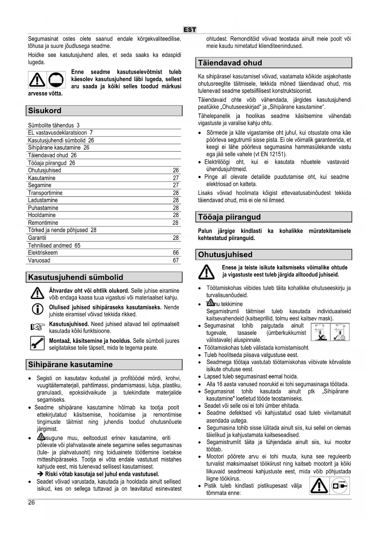 Kasutusjuhised. Need juhised aitavad teil optimaalselt kasutada kõiki funktsioone. Montaaž, käsitsemine ja hooldus. Selle sümboli juures selgitatakse teile täpselt, mida te tegema peate. Sihipärane kasutamine Segisti on kasutatav kodustel ja profitöödel mördi, krohvi, vuugitäitematerjali, pahtlimassi, pindamismassi, lubja, plastiku, granulaadi, epoksiidvaikude ja tulekindlate materjalide segamiseks. Seadme sihipärane kasutamine hõlmab ka tootja poolt ettekirjutatud käsitsemise, hooldamise ja remontimise tingimuste täitmist ning juhendis toodud ohutusnõuete järgimist. Igasugune muu, eeltoodust erinev kasutamine, eriti põlevate või plahvatavate ainete segamine selles segumasinas (tule- ja plahvatusoht) ning toiduainete töötlemine loetakse mittesihipäraseks. Tootja ei võta endale vastutust mistahes kahjude eest, mis tulenevad sellisest kasutamisest. Riski võtab kasutaja sel juhul enda vastutusel. Seadet võivad varustada, kasutada ja hooldada ainult sellised isikud, kes on sellega tuttavad ja on teavitatud esinevatest ohtudest. Remonditöid võivad teostada ainult meie poolt või meie kaudu nimetatud klienditeenindused. Täiendavad ohud Ka sihipärasel kasutamisel võivad, vaatamata kõikide asjakohaste ohutusreeglite täitmisele, tekkida mõned täiendavad ohud, mis tulenevad seadme spetsiifilisest konstruktsioonist. Täiendavaid ohte võib vähendada, järgides kasutusjuhendi peatükke „Ohutuseeskirjad“ ja „Sihipärane kasutamine“. Tähelepanelik ja hoolikas seadme käsitsemine vähendab vigastuste ja varalise kahju ohtu. Sõrmede ja käte vigastamise oht juhul, kui otsustate oma käe pöörleva segutrumli sisse pista. Ei ole võimalik garanteerida, et keegi ei lähe pöörleva segumasina hammasülekande vastu ega jää selle vahele (vt EN 12151). Elektrilöögi oht, kui ei kasutata nõuetele vastavaid ühendusjuhtmeid. Pinge all olevate detailide puudutamise oht, kui seadme elektriosad on katteta. Lisaks võivad hoolimata kõigist ettevaatusabinõudest tekkida täiendavad ohud, mis ei ole nii ilmsed. Tööaja piirangud Palun järgige kindlasti ka kohalikke müratekitamisele kehtestatud piiranguid. Ohutusjuhised