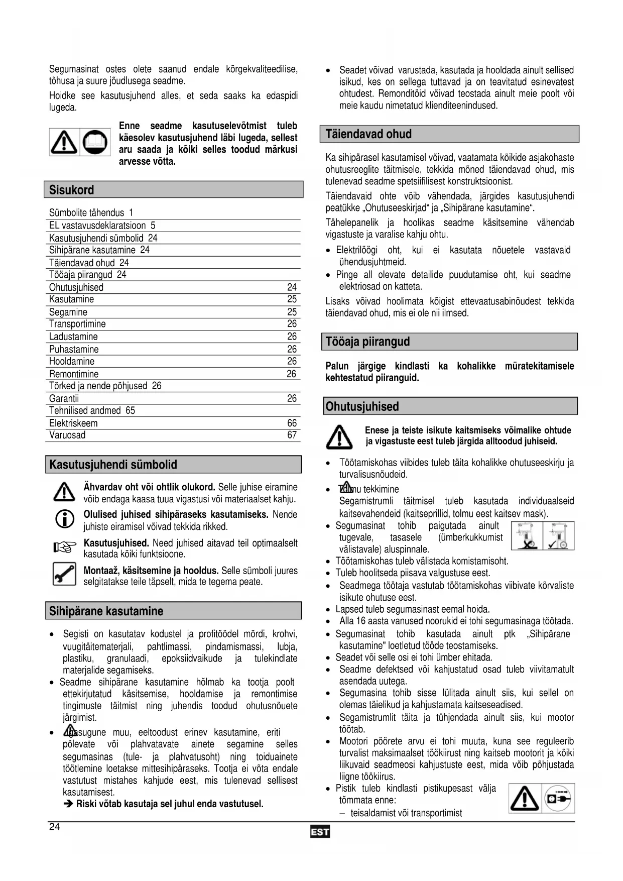 Sisukord Sümbolite tähendus 1 EL vastavusdeklaratsioon 5 Kasutusjuhendi sümbolid 24 Sihipärane kasutamine 24 Täiendavad ohud 24 Tööaja piirangud 24 Ohutusjuhised 24 Kasutamine 25 Segamine 25 Transportimine 26 Ladustamine 26 Puhastamine 26 Hooldamine 26 Remontimine 26 Tõrked ja nende põhjused 26 Garantii 26 Tehnilised andmed 65 Elektriskeem 66 Varuosad 67