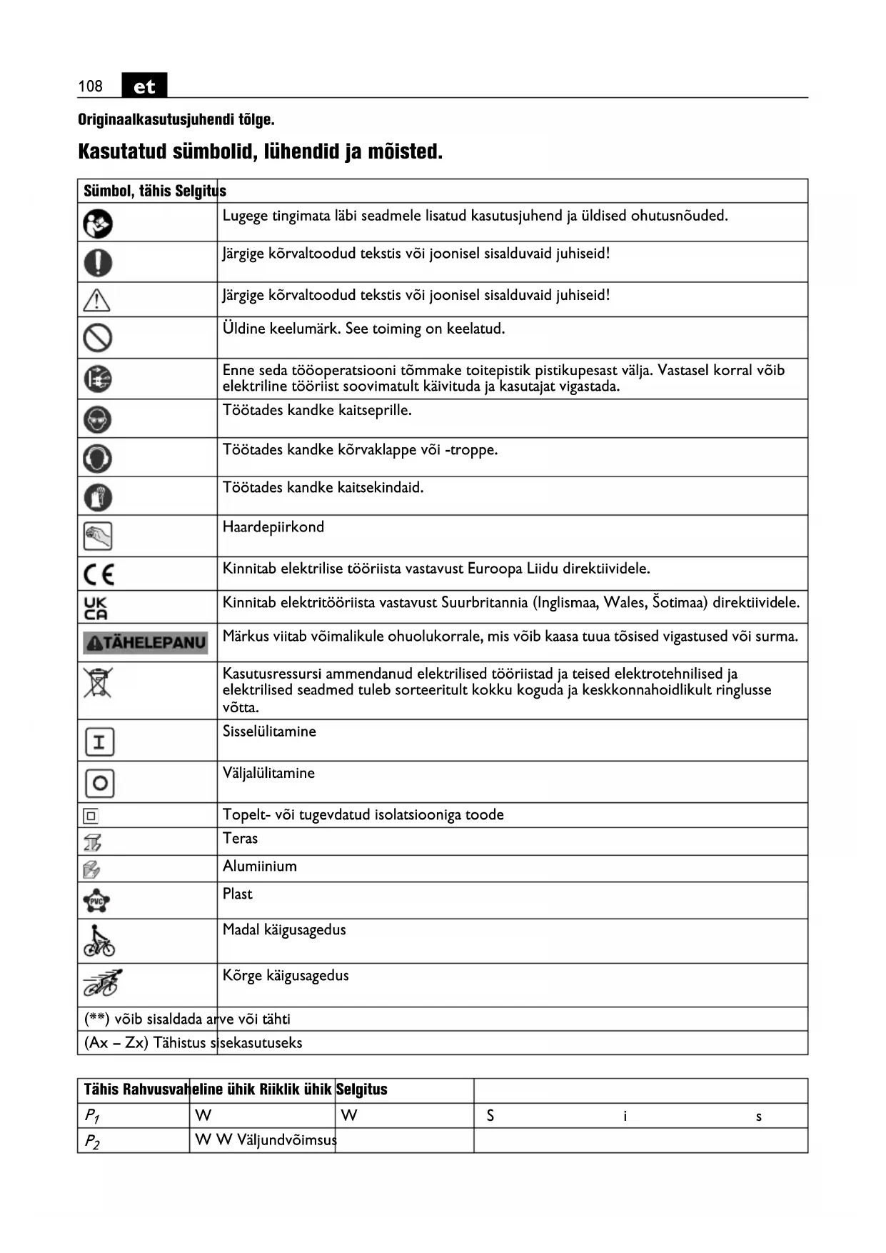 Originaalkasutusjuhendi tõlge. Kasutatud sümbolid, lühendid ja mõisted. Sümbol, tähis Selgitus Lugege tingimata läbi seadmele lisatud kasutusjuhend ja üldised ohutusnõuded. Järgige kõrvaltoodud tekstis või joonisel sisalduvaid juhiseid! Järgige kõrvaltoodud tekstis või joonisel sisalduvaid juhiseid! Üldine keelumärk. See toiming on keelatud. Enne seda tööoperatsiooni tõmmake toitepistik pistikupesast välja. Vastasel korral võib elektriline tööriist soovimatult käivituda ja kasutajat vigastada. Töötades kandke kaitseprille. Töötades kandke kõrvaklappe või -troppe. Töötades kandke kaitsekindaid. Haardepiirkond Kinnitab elektrilise tööriista vastavust Euroopa Liidu direktiividele. Kinnitab elektritööriista vastavust Suurbritannia (Inglismaa, Wales, Šotimaa) direktiividele. Märkus viitab võimalikule ohuolukorrale, mis võib kaasa tuua tõsised vigastused või surma. Kasutusressursi ammendanud elektrilised tööriistad ja teised elektrotehnilised ja elektrilised seadmed tuleb sorteeritult kokku koguda ja keskkonnahoidlikult ringlusse võtta. Sisselülitamine Väljalülitamine Topelt- või tugevdatud isolatsiooniga toode Teras Alumiinium Plast Madal käigusagedus Kõrge käigusagedus (**) võib sisaldada arve või tähti (Ax – Zx) Tähistus sisekasutuseks Tähis Rahvusvaheline ühik Riiklik ühik Selgitus