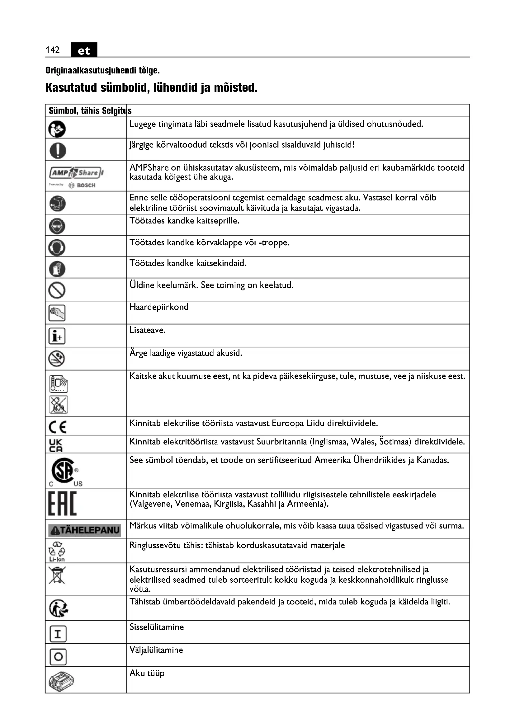Originaalkasutusjuhendi tõlge. Kasutatud sümbolid, lühendid ja mõisted. Sümbol, tähis Selgitus Lugege tingimata läbi seadmele lisatud kasutusjuhend ja üldised ohutusnõuded. Järgige kõrvaltoodud tekstis või joonisel sisalduvaid juhiseid! AMPShare on ühiskasutatav akusüsteem, mis võimaldab paljusid eri kaubamärkide tooteid kasutada kõigest ühe akuga. Enne selle tööoperatsiooni tegemist eemaldage seadmest aku. Vastasel korral võib elektriline tööriist soovimatult käivituda ja kasutajat vigastada. Töötades kandke kaitseprille. Töötades kandke kõrvaklappe või -troppe. Töötades kandke kaitsekindaid. Üldine keelumärk. See toiming on keelatud. Haardepiirkond Lisateave. Ärge laadige vigastatud akusid. Kaitske akut kuumuse eest, nt ka pideva päikesekiirguse, tule, mustuse, vee ja niiskuse eest. Kinnitab elektrilise tööriista vastavust Euroopa Liidu direktiividele. Kinnitab elektritööriista vastavust Suurbritannia (Inglismaa, Wales, Šotimaa) direktiividele. See sümbol tõendab, et toode on sertifitseeritud Ameerika Ühendriikides ja Kanadas. Kinnitab elektrilise tööriista vastavust tolliliidu riigisisestele tehnilistele eeskirjadele (Valgevene, Venemaa, Kirgiisia, Kasahhi ja Armeenia). Märkus viitab võimalikule ohuolukorrale, mis võib kaasa tuua tõsised vigastused või surma. Ringlussevõtu tähis: tähistab korduskasutatavaid materjale Kasutusressursi ammendanud elektrilised tööriistad ja teised elektrotehnilised ja elektrilised seadmed tuleb sorteeritult kokku koguda ja keskkonnahoidlikult ringlusse võtta. Tähistab ümbertöödeldavaid pakendeid ja tooteid, mida tuleb koguda ja käidelda liigiti. Sisselülitamine Väljalülitamine Aku tüüp max.50°C143