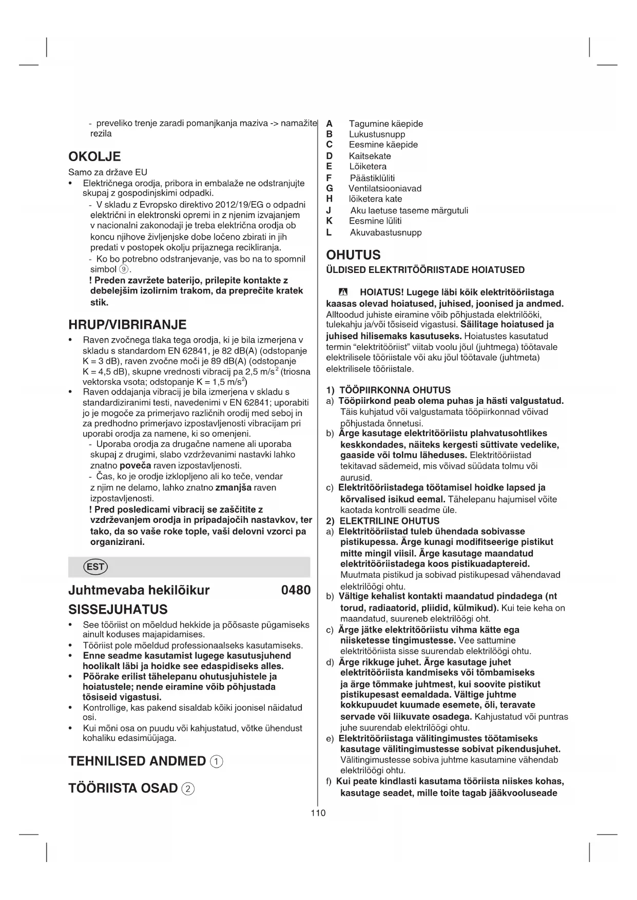 - Standardi EN 62841 kohaselt mõõdetuna on tööriista helirõhu tase 82 dB(A) (määramatus K = 3 dB) ja - Vajutage ja hoidke eesmist lülitit K. - Nupu B vajutamine - Tööriista sisselülitamiseks vajutage päästiklülitit F. - Tööriista väljalülitamiseks vabastage päästiklüliti F.