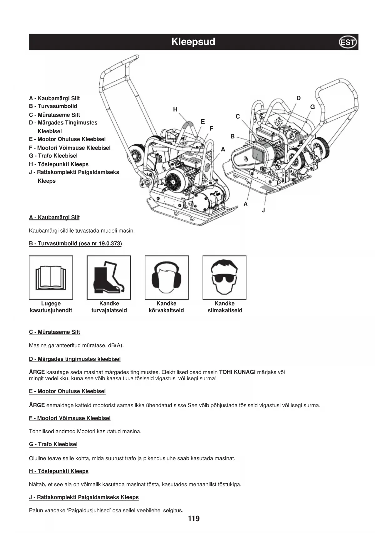 A - Kaubamärgi Silt Kaubamärgi sildile tuvastada mudeli masin. B - Turvasümbolid (osa nr 19.0.373) Lugege kasutusjuhendit Kandke turvajalatseid Kandke kõrvakaitseid Kandke silmakaitseid C - Mürataseme Silt Masina garanteeritud müratase, dB(A). D - Märgades tingimustes kleebisel ÄRGE kasutage seda masinat märgades tingimustes. Elektrilised osad masin TOHI KUNAGI märjaks või mingit vedelikku, kuna see võib kaasa tuua tõsiseid vigastusi või isegi surma! E - Mootor Ohutuse Kleebisel ÄRGE eemaldage katteid mootorist samas ikka ühendatud sisse See võib põhjustada tõsiseid vigastusi või isegi surma. F - Mootori Võimsuse Kleebisel Tehnilised andmed Mootori kasutatud masina. G - Trafo Kleebisel Oluline teave selle kohta, mida suurust trafo ja pikendusjuhe saab kasutada masinat. H - Tõstepunkti Kleeps Näitab, et see ala on võimalik kasutada masinat tõsta, kasutades mehaanilist tõstukiga. J - Rattakomplekti Paigaldamiseks Kleeps Palun vaadake ‘Paigaldusjuhised’ osa sellel veebilehel selgitus. Kleepsud EST A - Kaubamärgi Silt B - Turvasümbolid C - Mürataseme Silt D - Märgades Tingimustes Kleebisel E - Mootor Ohutuse Kleebisel F - Mootori Võimsuse Kleebisel G - Trafo Kleebisel H - Tõstepunkti Kleeps J - Rattakomplekti Paigaldamiseks Kleeps