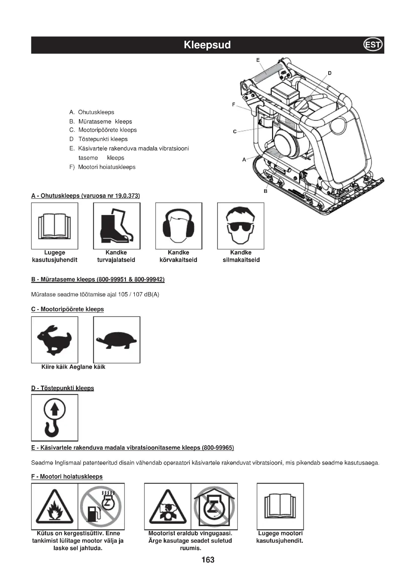 ) 2.45 2.64 Kasutus- Aeg - Honda (Mins) 831 342 Kasutus- Aeg - Hatz (Mins) 499 430163 Kleepsud EST A - Ohutuskleeps (varuosa nr 19.0.373) Lugege kasutusjuhendit Kandke turvajalatseid Kandke kõrvakaitseid Kandke silmakaitseid B - Mürataseme kleeps (800-99951 & 800-99942) Müratase seadme töötamise ajal 105 / 107 dB(A) C - Mootoripöörete kleeps A. Ohutuskleeps B. Mürataseme kleeps C. Mootoripöörete kleeps D Tõstepunkti kleeps E. Käsivartele rakenduva madala vibratsiooni taseme kleeps F) Mootori hoiatuskleeps Kiire käik Aeglane käik D - Tõstepunkti kleeps E - Käsivartele rakenduva madala vibratsioonitaseme kleeps (800-99965) Seadme Inglismaal patenteeritud disain vähendab operaatori käsivartele rakenduvat vibratsiooni, mis pikendab seadme kasutusaega. F - Mootori hoiatuskleeps Lugege mootori kasutusjuhendit. Kütus on kergestisüttiv. Enne tankimist lülitage mootor välja ja laske sel jahtuda. Mootorist eraldub vingugaasi. Ärge kasutage seadet suletud ruumis.