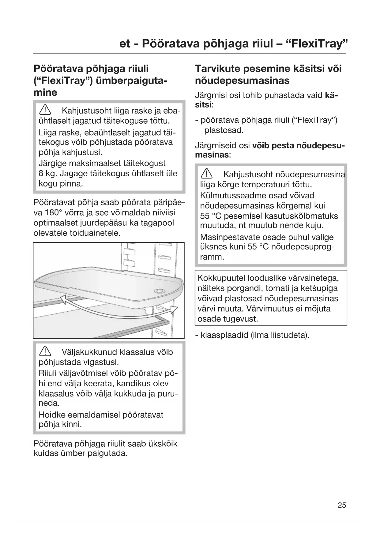 Pööratava põhjaga riiuli (“FlexiTray”) ümberpaiguta- mine Kahjustusoht liiga raske ja eba- ühtlaselt jagatud täitekoguse tõttu. Liiga raske, ebaühtlaselt jagatud täi- tekogus võib põhjustada pööratava põhja kahjustusi. Järgige maksimaalset täitekogust 8kg. Jagage täitekogus ühtlaselt üle kogu pinna. Pööratavat põhja saab pöörata päripäe- va 180° võrra ja see võimaldab niiviisi optimaalset juurdepääsu ka tagapool olevatele toiduainetele. Väljakukkunud klaasalus võib põhjustada vigastusi. Riiuli väljavõtmisel võib pööratav põ- hi end välja keerata, kandikus olev klaasalus võib välja kukkuda ja puru- neda. Hoidke eemaldamisel pööratavat põhja kinni. Pööratava põhjaga riiulit saab ükskõik kuidas ümber paigutada. Tarvikute pesemine käsitsi või nõudepesumasinas Järgmisi osi tohib puhastada vaid kä- sitsi: - pööratava põhjaga riiuli (“FlexiTray”) plastosad. Järgmiseid osi võib pesta nõudepesu- masinas: Kahjustusoht nõudepesumasina liiga kõrge temperatuuri tõttu. Külmutusseadme osad võivad nõudepesumasinas kõrgemal kui 55°C pesemisel kasutuskõlbmatuks muutuda, nt muutub nende kuju. Masinpestavate osade puhul valige üksnes kuni 55°C nõudepesuprog- ramm. Kokkupuutel looduslike värvainetega, näiteks porgandi, tomati ja ketšupiga võivad plastosad nõudepesumasinas värvi muuta. Värvimuutus ei mõjuta osade tugevust. - klaasplaadid (ilma liistudeta).et - Pööratava põhjaga riiul – “FlexiTray”
