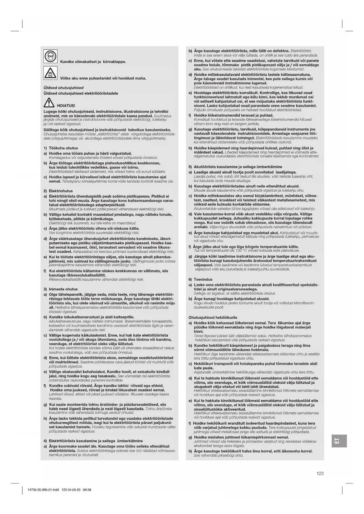 Võtke aku enne puhastamist või hooldust maha. Üldised ohutusjuhised Üldised ohutusjuhised elektritööriistadele HOIATUS! Lugege kõiki ohutusjuhiseid, instruktsioone, illustratsioone ja tehnilisi andmeid, mis on käesolevale elektritööriistale kaasa pandud. Suutmatus järgida ohutusjuhiseid ja instruktsioone võib põhjustada elektrilöögi, tulekahju ja / või raskeid vigastusi. Säilitage kõik ohutusjuhised ja instruktsioonid tulevikus kasutamiseks. Ohutusjuhistes kasutatav mõiste „elektritööriist“ viitab võrgutoitega elektritööriista- dele (võrgujuhtmega) või akutoitega elektritööriistadele (ilma võrgujuhtmeta).