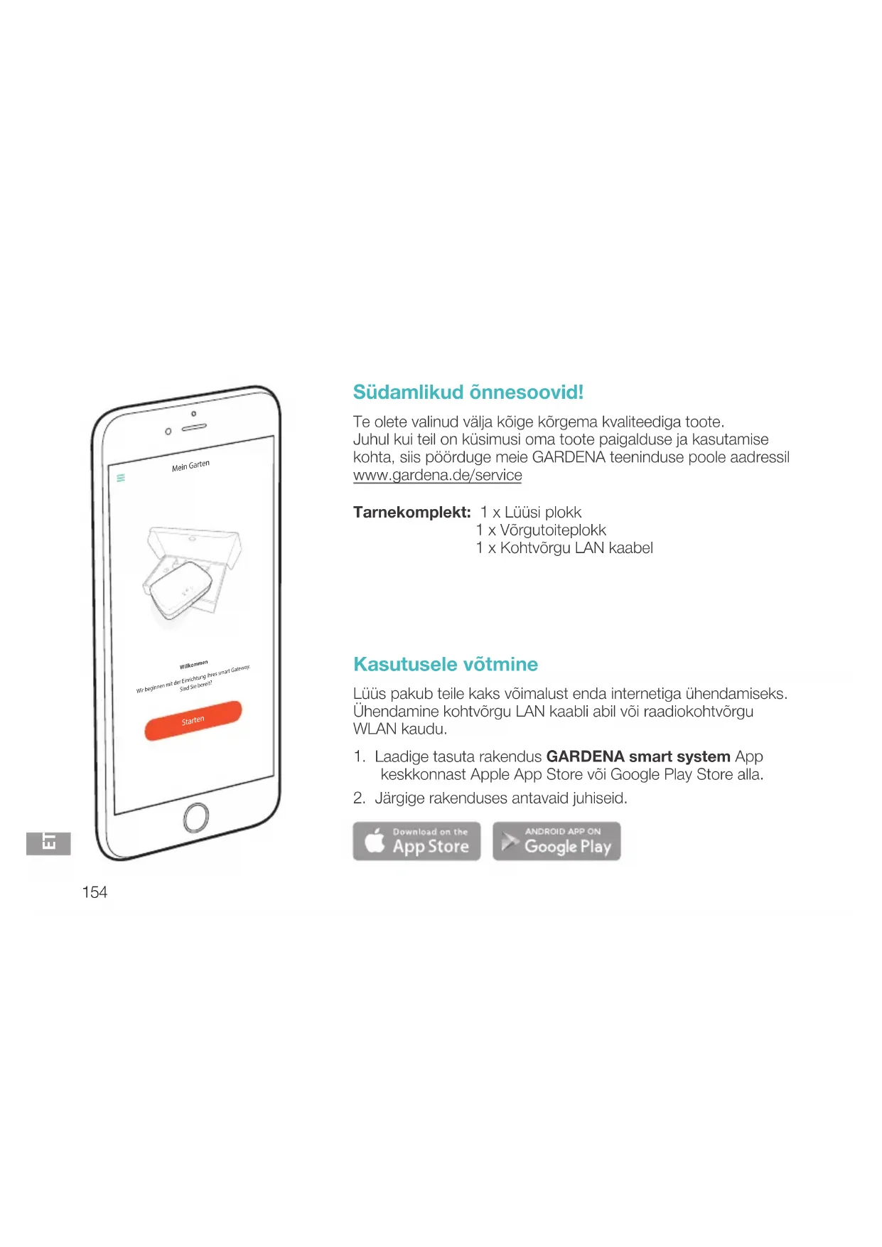 Südamlikud õnnesoovid! Te olete valinud välja kõige kõrgema kvaliteediga toote. Juhul kui teil on küsimusi oma toote paigalduse ja kasutamise kohta, siis pöörduge meie GARDENA teeninduse poole aadressil www.gardena.de/service Tarnekomplekt: 1 x Lüüsi plokk 1 x Võrgutoiteplokk 1 x Kohtvõrgu LAN kaabel Kasutusele võtmine Lüüs pakub teile kaks võimalust enda internetiga ühendamiseks. Ühendamine kohtvõrgu LAN kaabli abil või raadiokohtvõrgu WLAN kaudu.