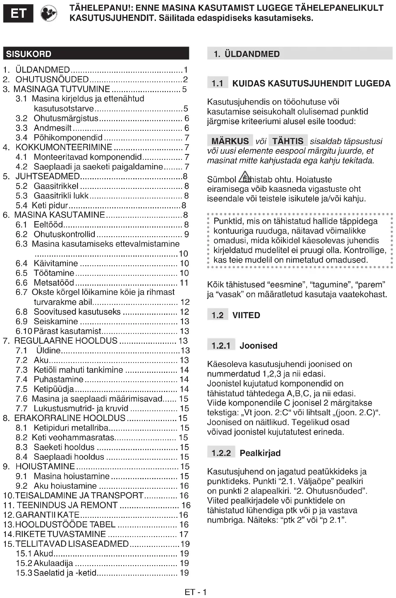 Kasutusjuhend on jagatud peatükkideks ja punktideks. Punkti “2.1. Väljaõpe” pealkiri on punkti 2 alapealkiri. "2. Ohutusnõuded”. Viited pealkirjadele või punktidele on tähistatud lühendiga ptk või p ja vastava numbriga. Näiteks: “ptk 2” või “p 2.1”.ET - 2