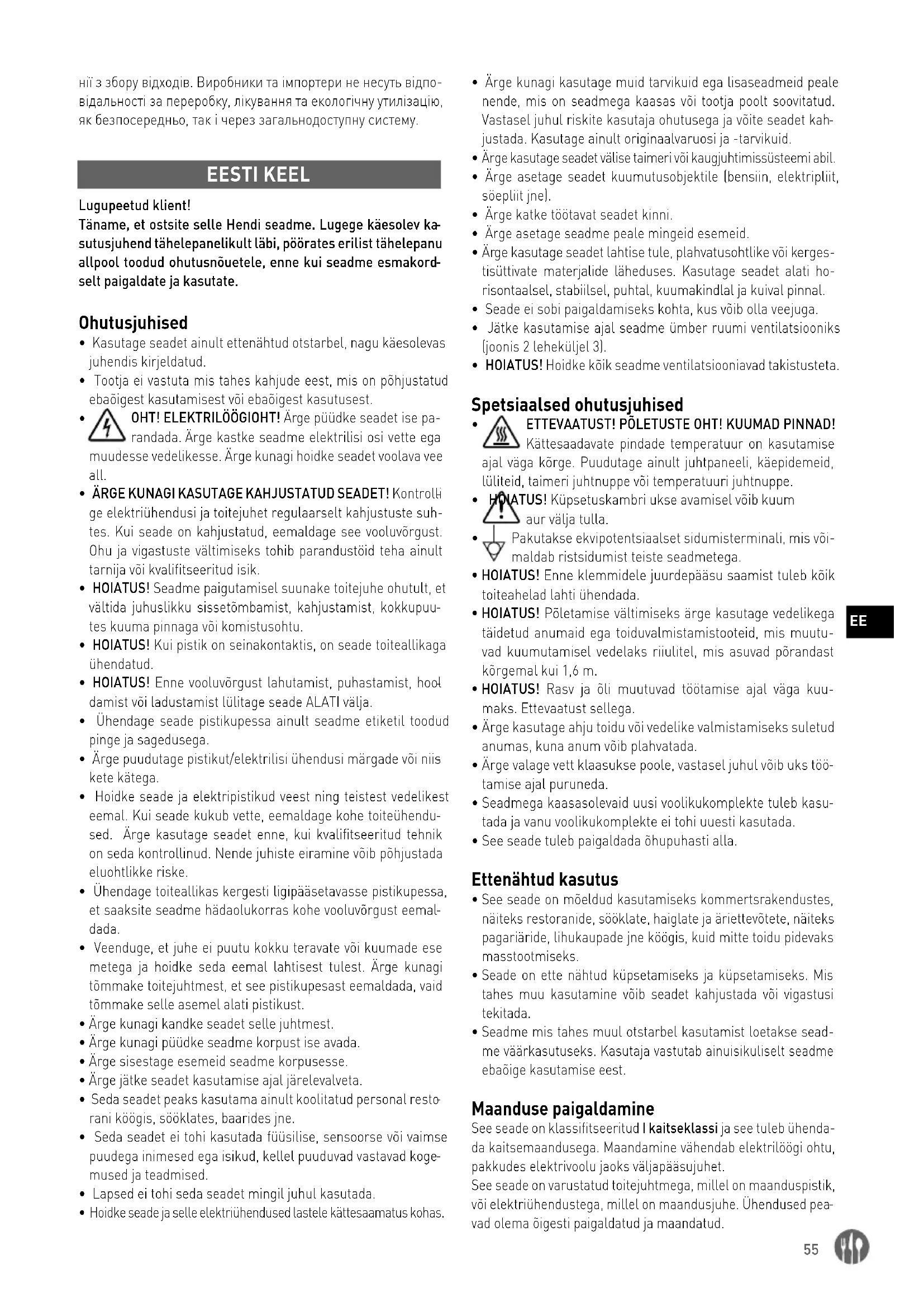 - HOIATUS! Põletamise vältimiseks ärge kasutage vedelikega täidetud anumaid ega toiduvalmistamistooteid, mis muutu