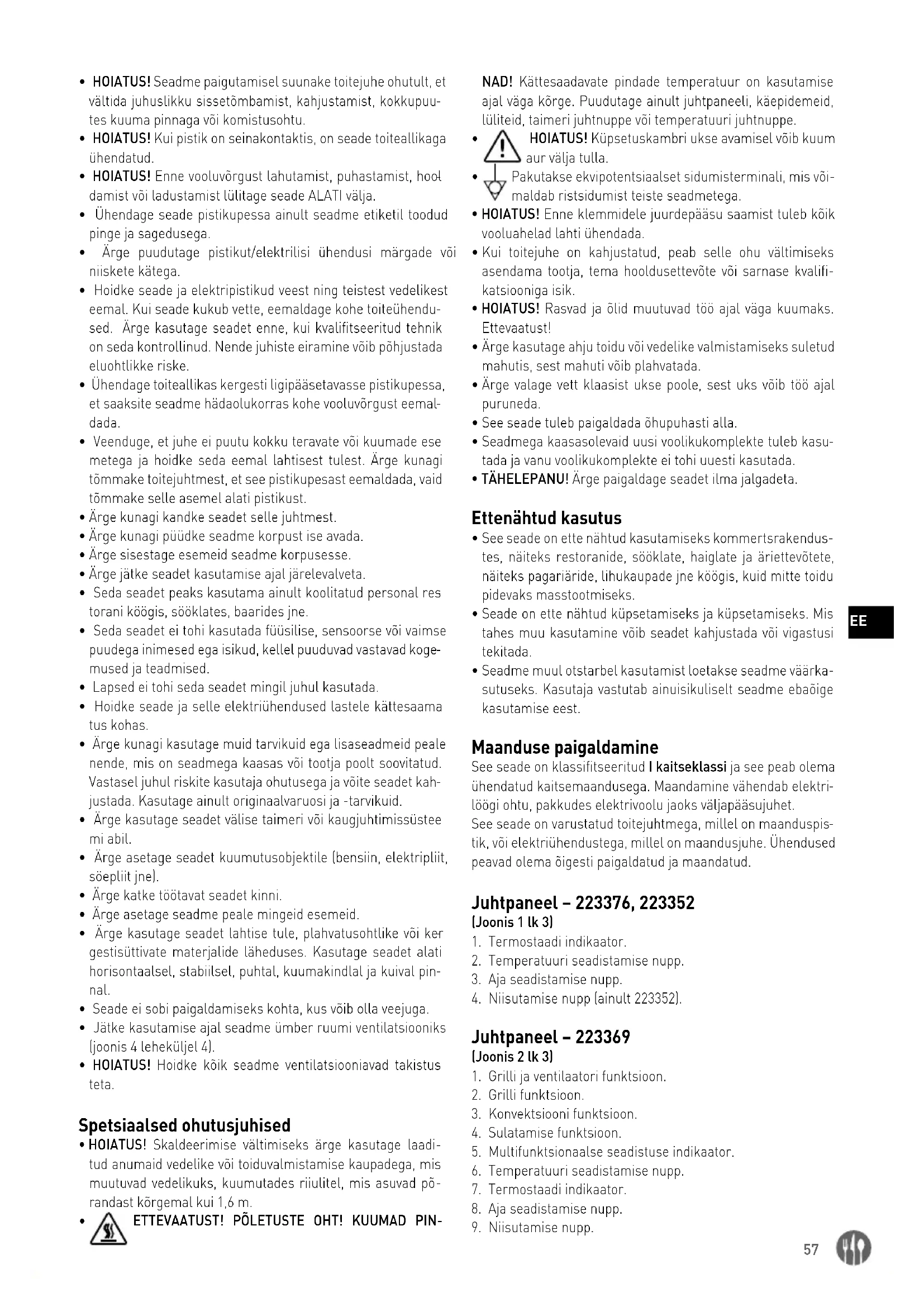 NAD! Kättesaadavate pindade temperatuur on kasutamise ajal väga kõrge. Puudutage ainult juhtpaneeli, käepidemeid, lüliteid, taimeri juhtnuppe või temperatuuri juhtnuppe.