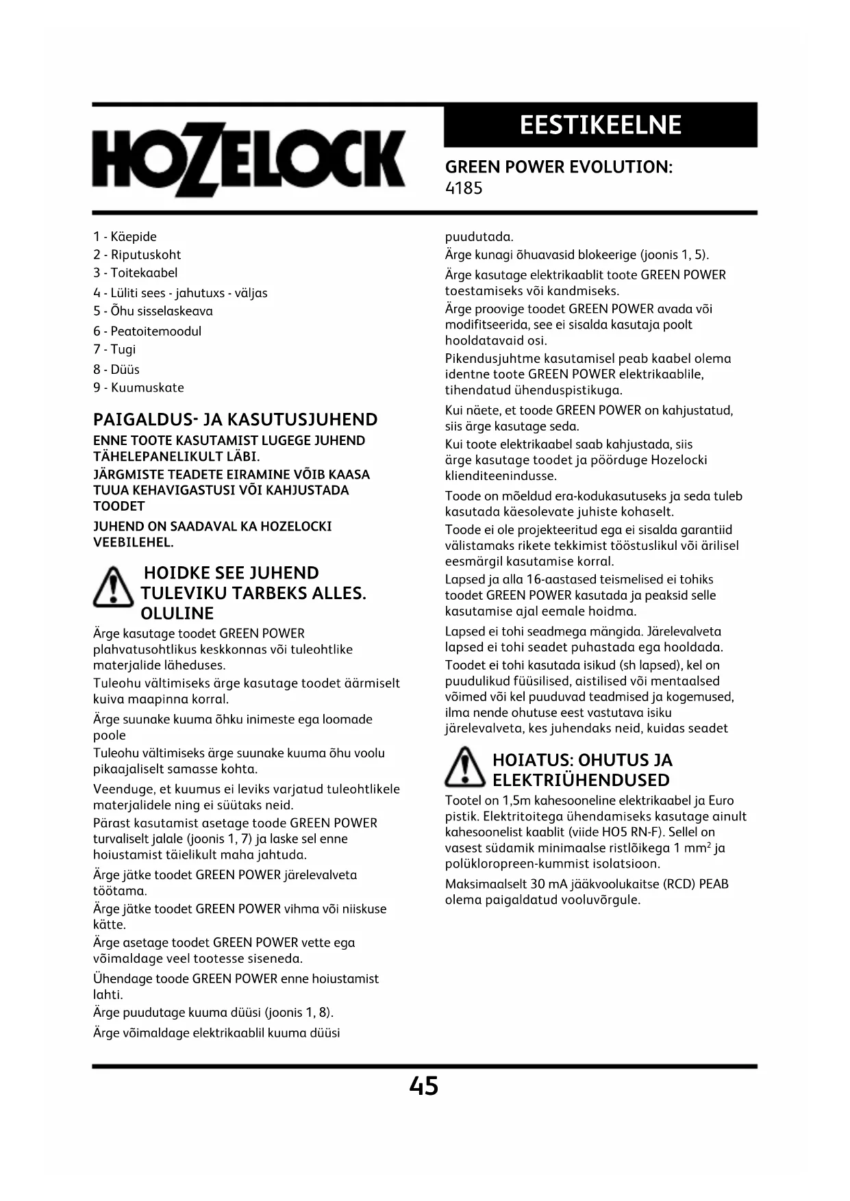 TULEVIKU TARBEKS ALLES. OLULINE Ärge kasutage toodet GREEN POWER plahvatusohtlikus keskkonnas või tuleohtlike materjalide läheduses. Tuleohu vältimiseks ärge kasutage toodet äärmiselt kuiva maapinna korral. Ärge suunake kuuma õhku inimeste ega loomade poole Tuleohu vältimiseks ärge suunake kuuma õhu voolu pikaajaliselt samasse kohta. Veenduge, et kuumus ei leviks varjatud tuleohtlikele materjalidele ning ei süütaks neid. Pärast kasutamist asetage toode GREEN POWER turvaliselt jalale (joonis 1, 7) ja laske sel enne hoiustamist täielikult maha jahtuda. Ärge jätke toodet GREEN POWER järelevalveta töötama. Ärge jätke toodet GREEN POWER vihma või niiskuse kätte. Ärge asetage toodet GREEN POWER vette ega võimaldage veel tootesse siseneda. Ühendage toode GREEN POWER enne hoiustamist lahti. Ärge puudutage kuuma düüsi (joonis 1, 8). Ärge võimaldage elektrikaablil kuuma düüsi puudutada. Ärge kunagi õhuavasid blokeerige (joonis 1, 5). Ärge kasutage elektrikaablit toote GREEN POWER toestamiseks või kandmiseks. Ärge proovige toodet GREEN POWER avada või modifitseerida, see ei sisalda kasutaja poolt hooldatavaid osi. Pikendusjuhtme kasutamisel peab kaabel olema identne toote GREEN POWER elektrikaablile, tihendatud ühenduspistikuga. Kui näete, et toode GREEN POWER on kahjustatud, siis ärge kasutage seda. Kui toote elektrikaabel saab kahjustada, siis ärge kasutage toodet ja pöörduge Hozelocki klienditeenindusse. Toode on mõeldud era-kodukasutuseks ja seda tuleb kasutada käesolevate juhiste kohaselt. Toode ei ole projekteeritud ega ei sisalda garantiid välistamaks rikete tekkimist tööstuslikul või ärilisel eesmärgil kasutamise korral. Lapsed ja alla 16-aastased teismelised ei tohiks toodet GREEN POWER kasutada ja peaksid selle kasutamise ajal eemale hoidma. Lapsed ei tohi seadmega mängida. Järelevalveta lapsed ei tohi seadet puhastada ega hooldada. Toodet ei tohi kasutada isikud (sh lapsed), kel on puudulikud füüsilised, aistilised või mentaalsed võimed või kel puuduvad teadmised ja kogemused, ilma nende ohutuse eest vastutava isiku järelevalveta, kes juhendaks neid, kuidas seadet