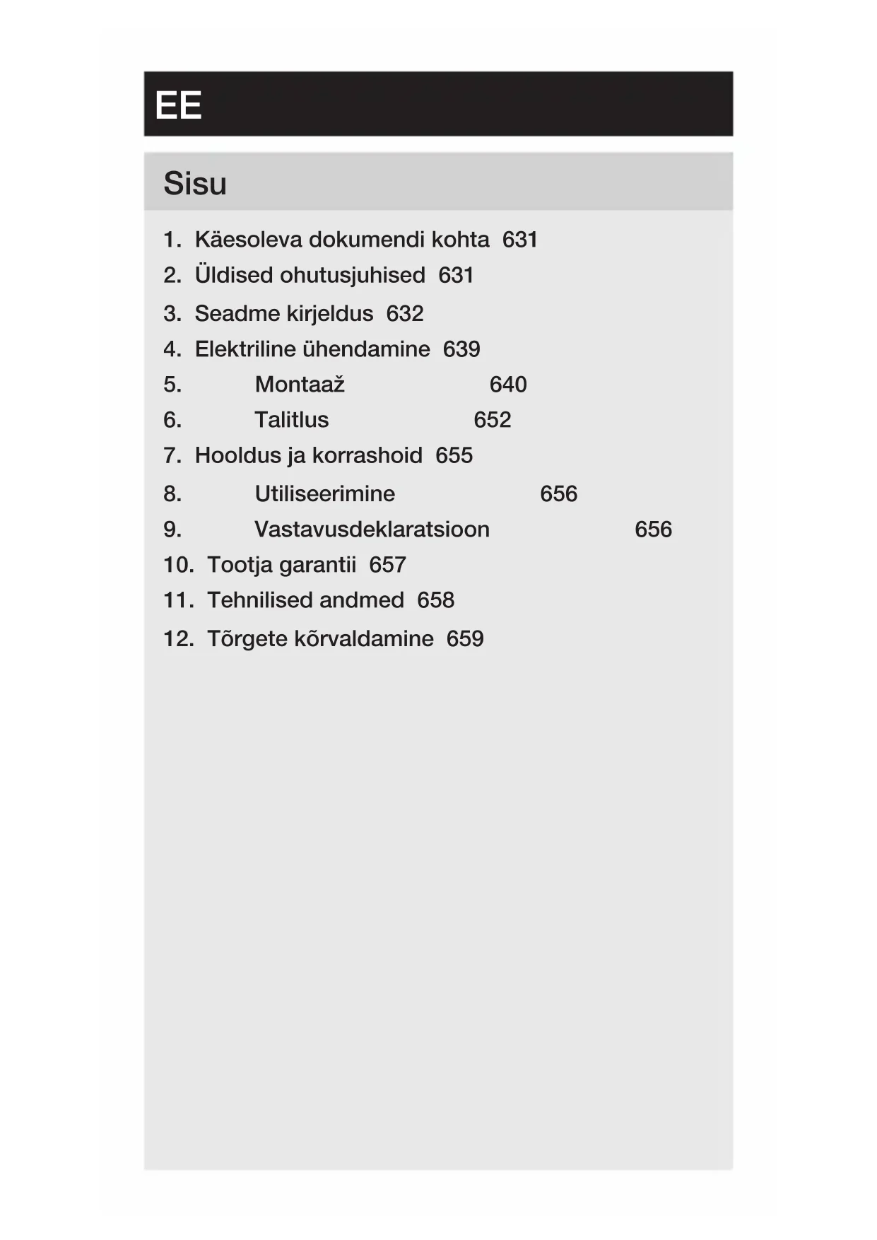 - Kontrollige kõiki koostedetaile kahjustuste suhtes. Ärge võtke toodet kahjustuste korral käiku.EE – 641 – Sisu