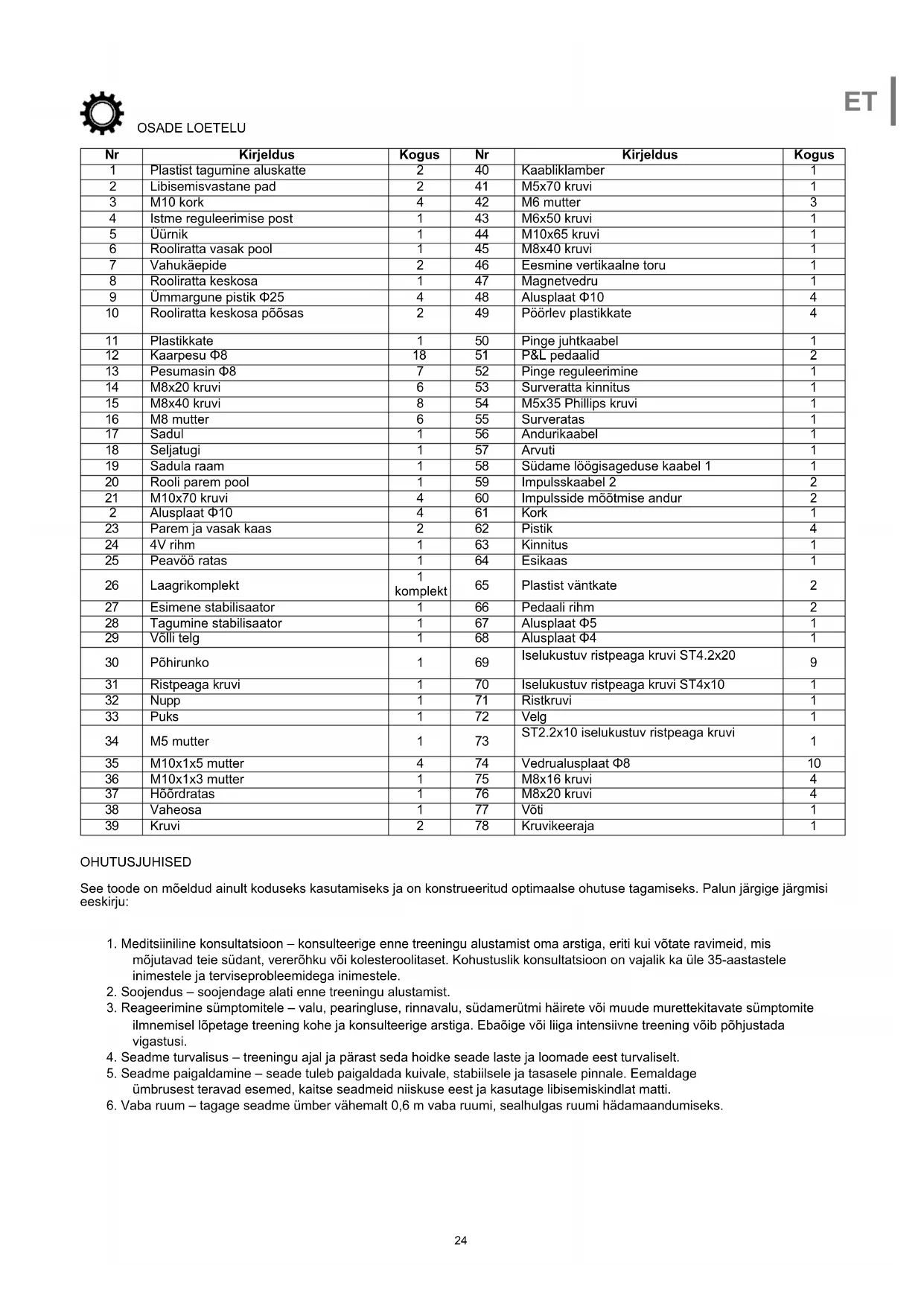 Seadme peatamiseks piisab lihtsalt pedaalide pedaalimise lõpetamisest – lukustussüsteemi ega ohutuspidurit ei ole. KOOSTAMINE